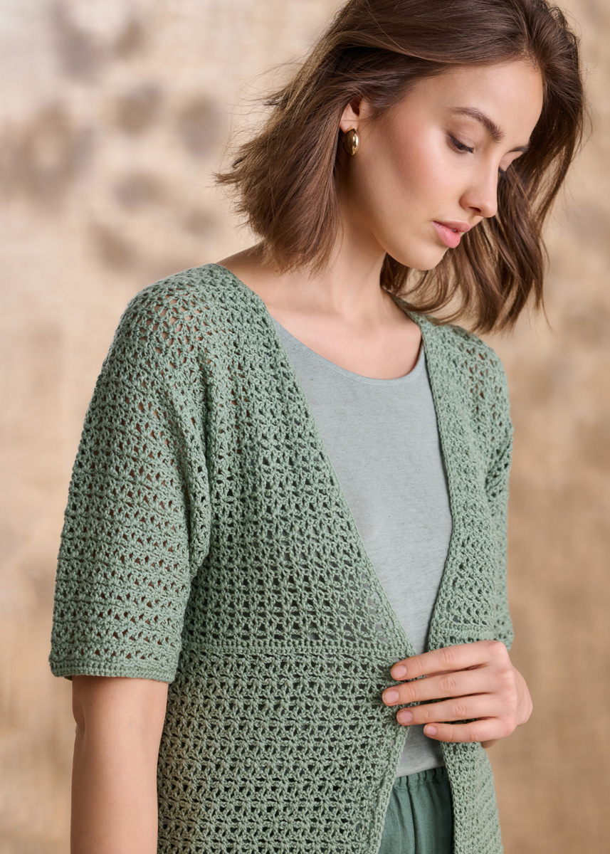 Lana Grossa-Kvalitet Summer Cashmere (90% bomuld, 10% kashmir, løbelængde 210 m/50 g), 300 (350 – 400) g resedagrøn (farve 23); hæklenål nr. 3 og 3½.