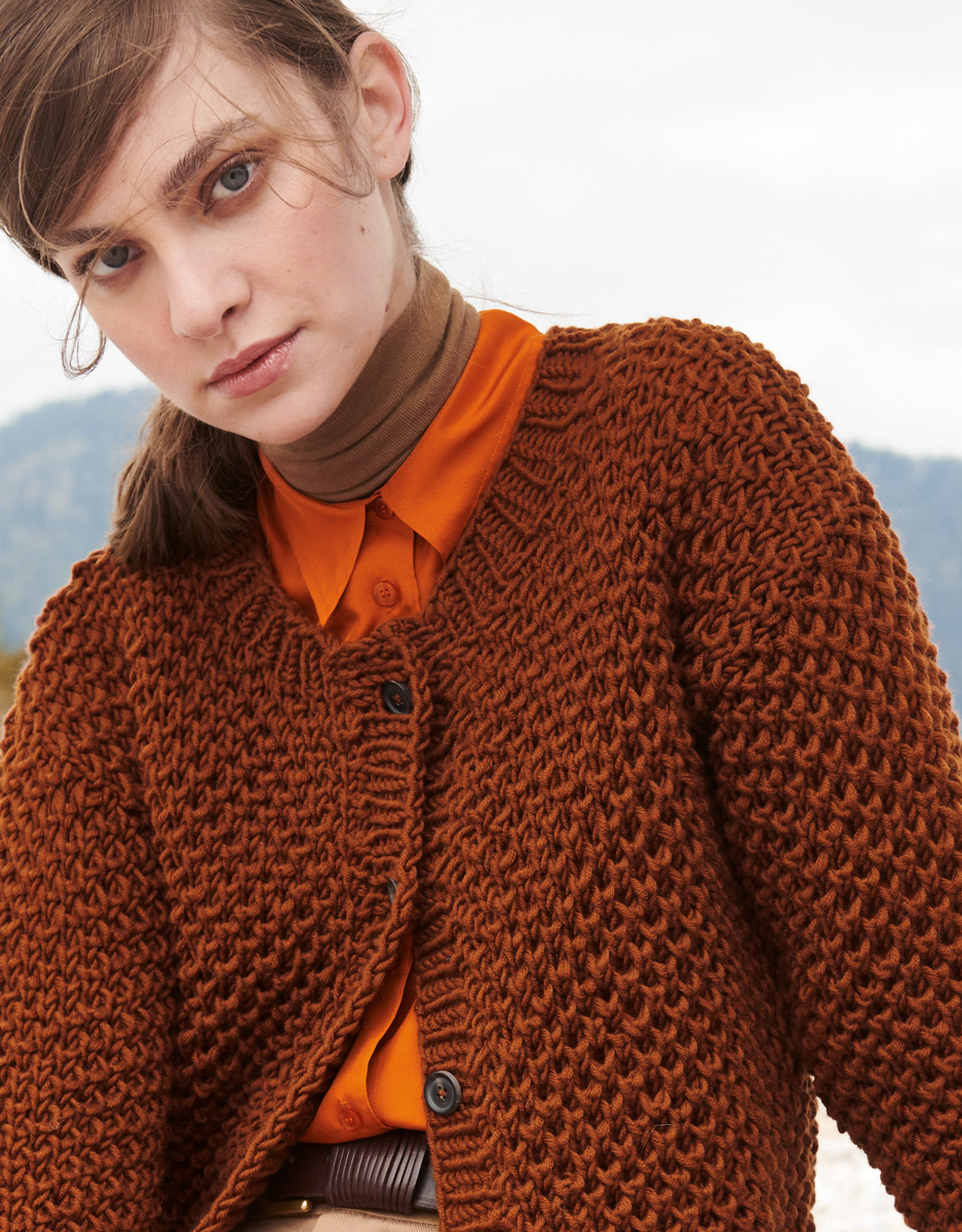 Lana Grossa Superbingo (100% virgin ull, löplängd 55 m/50 g), 750 (800 – 850) g rödbrun (färg 48); stickor nr. 6 och 8, 1 rundsticka nr. 6, 40 cm lång och 5 knappar från UNION KNOPF, art. 36428, färg 80, storlek 20 mm.