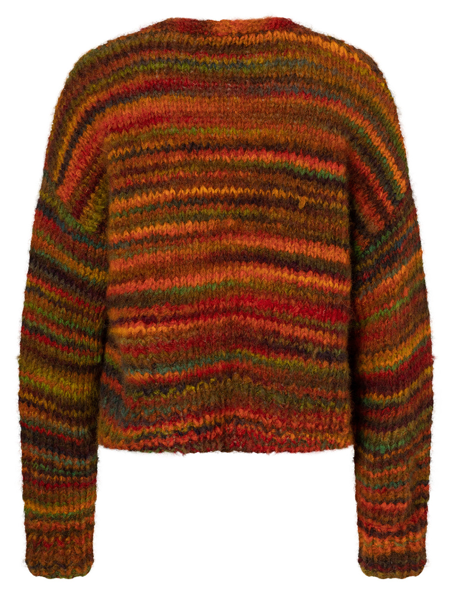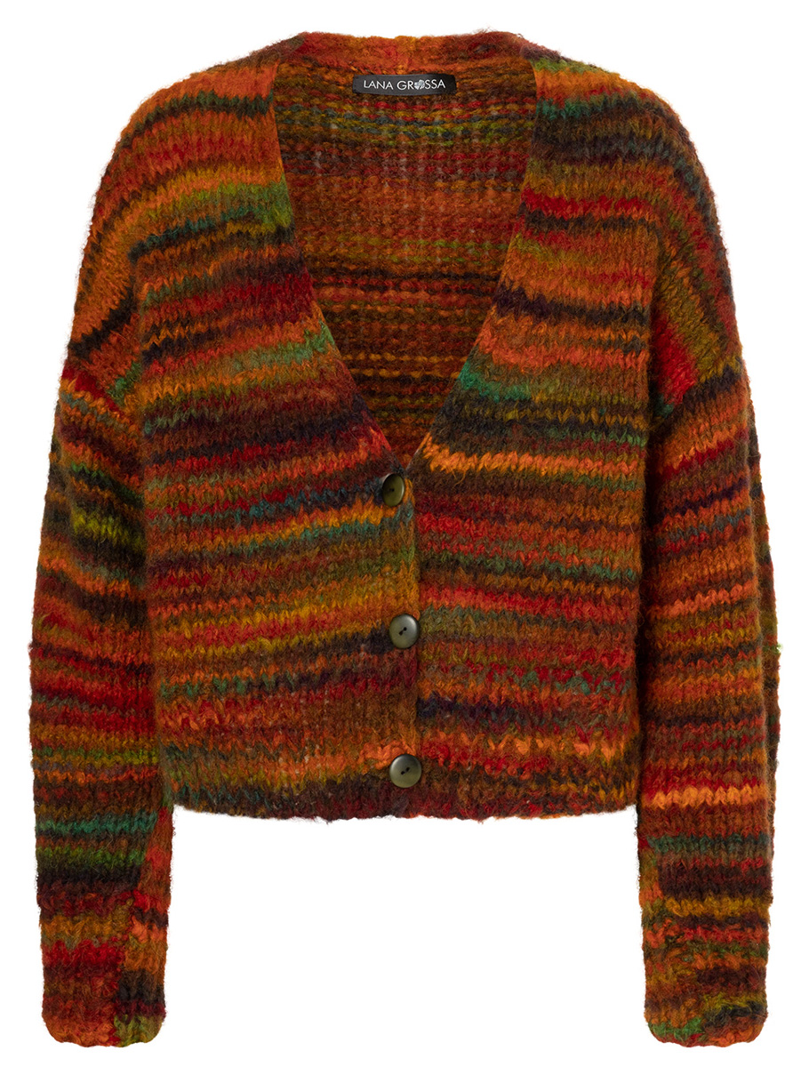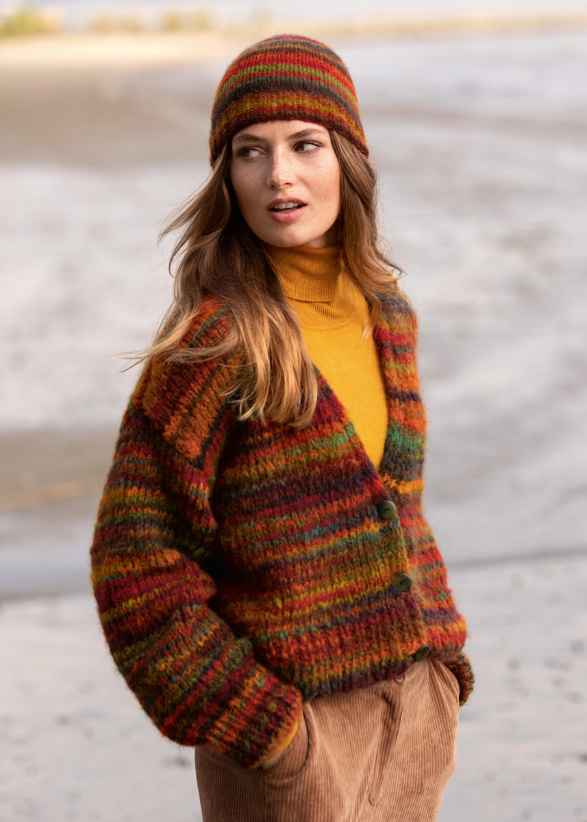Lana Grossa Twin 50 g (46% (baby) alpacka, 45% ren ny ull (merino), 9% polyamid, löplängd 85 m/50 g) 300 (350 – 400) g ljus grön/mörk grön/röd/orange/mörk röd/mörk brun (färg 202); stickor nr. 7 och 8, 3 knappar från UNION KNOPF, färg mörk grön, 22 mm.