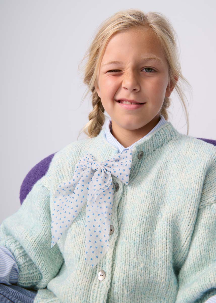 Lana Grossa-kvalitet „Twinny“ (97% ren ny ull (extrafin merino), 3% polyamid, löplängd = ca 100 m/50 g): ca 300 (350 - 350 - 400) g ecru/ljusturkos (färg 2); stickor nr. 4,5 och nr. 5; 1 kort rundsticka nr. 4,5; 6 pärlemorknappar diameter ca 15 mm, färg 76, Art-Nr 46286 från Union Knopf.