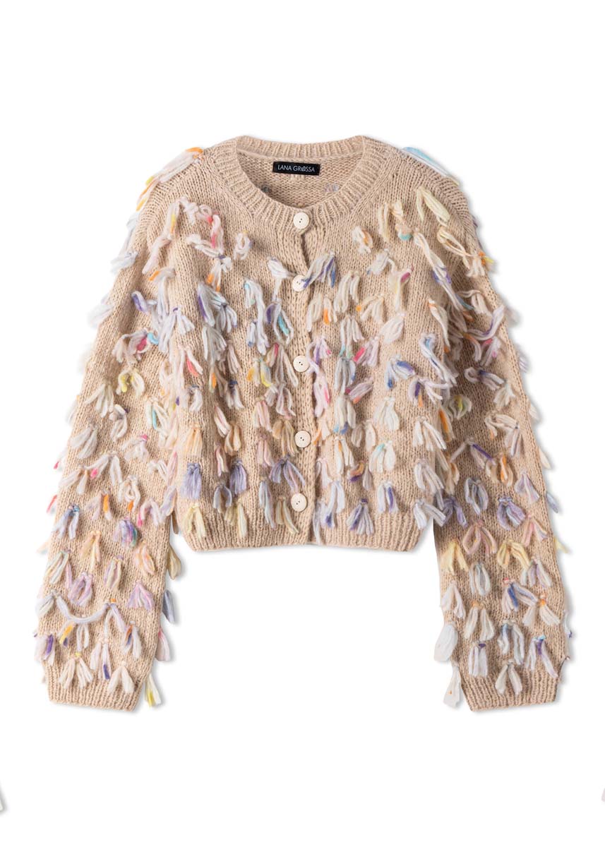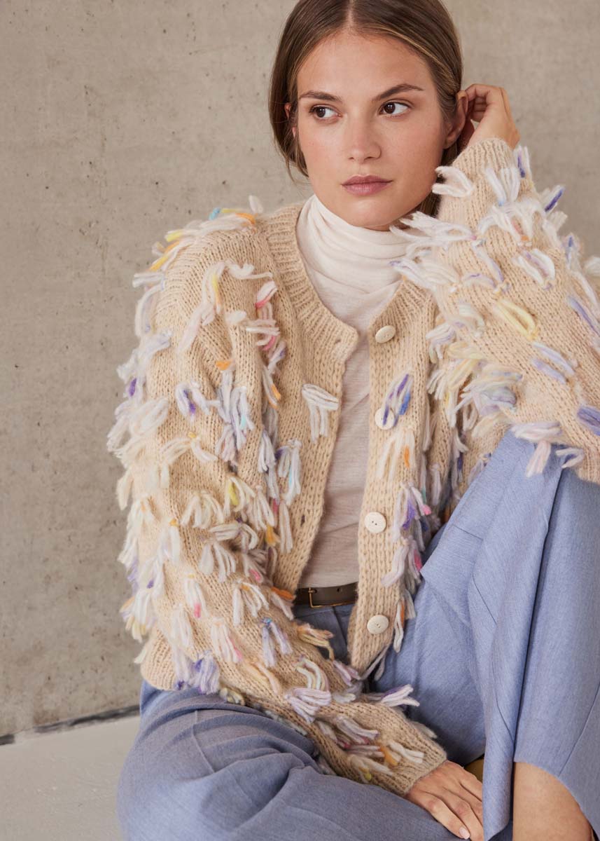 Lana Grossa Brigitte No. 2 (47% alpakka (baby), 45% bomull, 8% ny ull (merino), løpelengde 140 m/50 g), 350 (400 - 450) g i lys beige (farge 47) og Lana Grossa Cassata (54% ny ull (merino ekstrafin), 30% polyamid, 16% bomull, løpelengde 175 m/50 g), 100 g i råhvit/orange/fiolett/lysblå/gul (farge 8); strikkepinner nr. 5 og nr. 6; 1 rundpinne nr. 5, 60 cm lang; 5 beige knapper, 25 mm Ø.