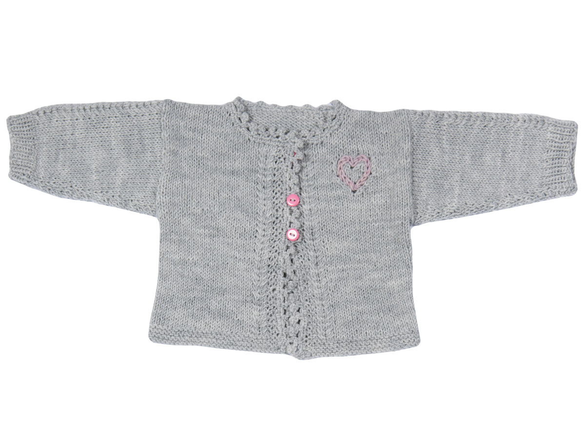 Lana Grossa-kvalitet ”Cool Wool Baby” (100 % ren ny uld, løbelængde = ca. 220 m / 50 gr.): 50(100) gr lysegrå (fv 241) og 50 gr rosa (fv 216), strikkepinde nr. 3, hæklenål nr. 2½, 3 knapper 10 mm Ø.