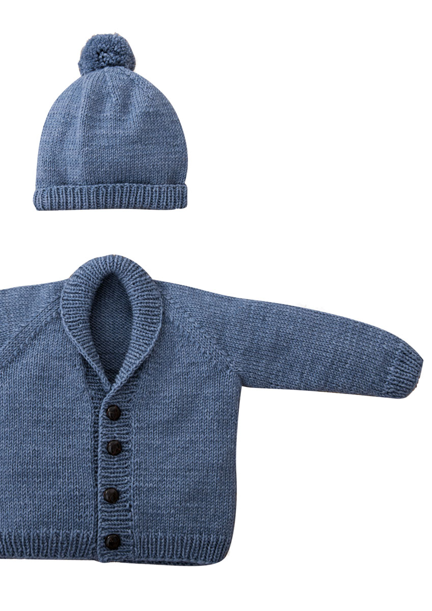 Wie gut doch dieser Pullunder, mit einem Kettenmuster gestrickt und zu Hemd und Jeans kombiniert, unserem niedlichen Baby-Boy steht. Genauso wie die Jacke mit Schalkragen und Raglanärmeln, zu der auch noch eine Mütze gehört. Ganz schön lässig, die Jungs!