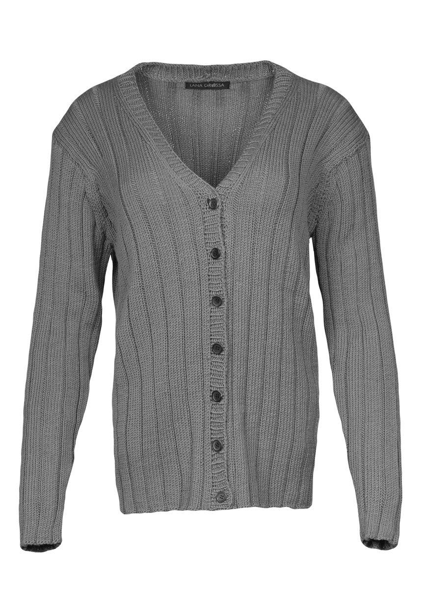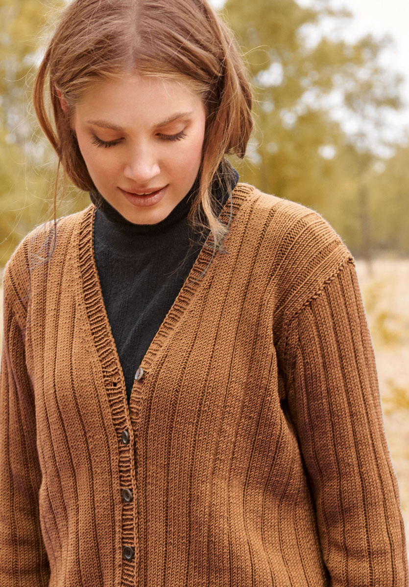 Lana Grossa-kvalitet ”Cool Wool” (100 % ren ny uld, løbelængde = ca. 160 m / 50 gr.): 550(600-650) gr karamel (fv 2054), strikkepinde nr. 3½, rundpind nr. 3½, 100 cm, 7 knapper fra UNION KNOPF, art. 36428, mørkebrun, 14 mm