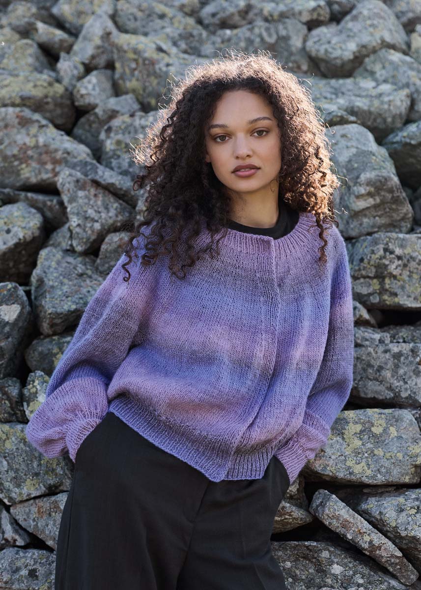 Lana Grossa-kvalitet „Gomitolo Gala“ (60 % ren ny ull, 38 % polyacryl, 2 % polyester, løpelengde = ca 700 m/200 g): 2 (2 - 2 - 3) nøster = ca 400 (400 - 400 - 600) g syrin/mauver/ grålila/blålila/fiolblå (farge 4027); kort og lange rundpinne nr. 4 og 4,5; settpinner nr. 4 og 4,5; 5 trykknapper med ca. 20 mm diameter.