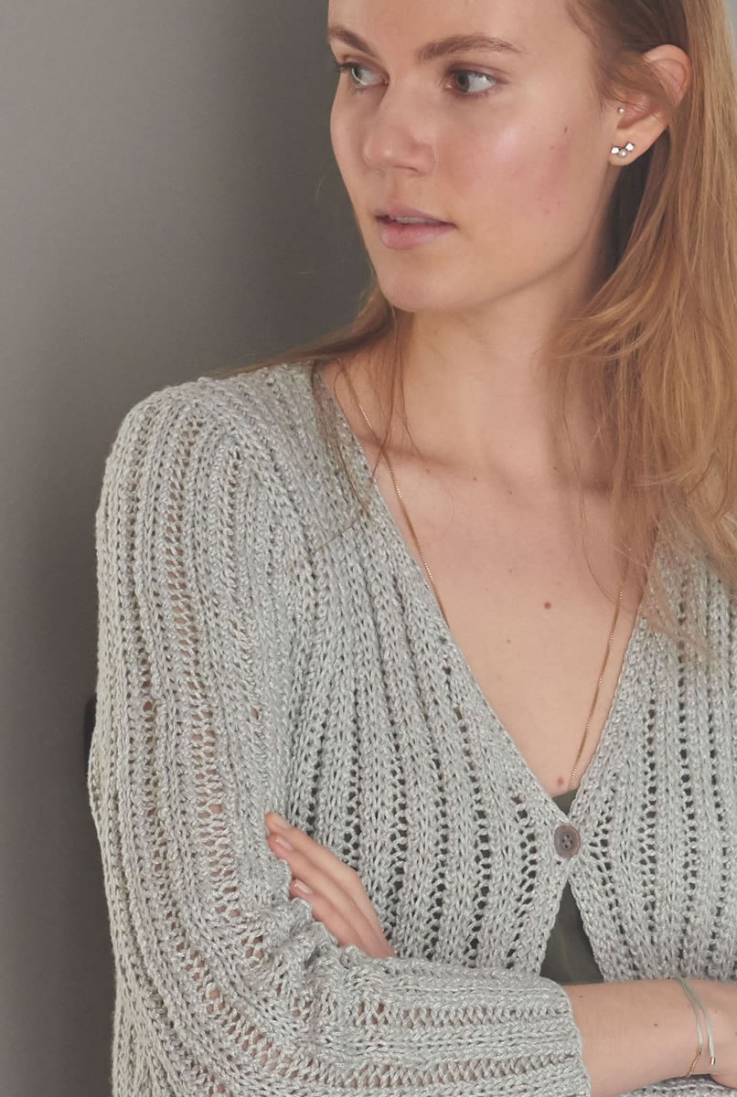 Lana Grossa Linarte (40% Viskose, 30% Baumwolle, 20% Leinen, 10% Polyamid, Lauflänge 125 m/50 g), 600 (650 – 700) g Silbergrau (Fb 60); Stricknadeln Nr. 4 und 4,5, 1 Häkelnadel Nr. 4; 4 Knöpfe von UNION KNOPF, Art. 452209, Fb Hellgrau, Gr. 15 mm.
