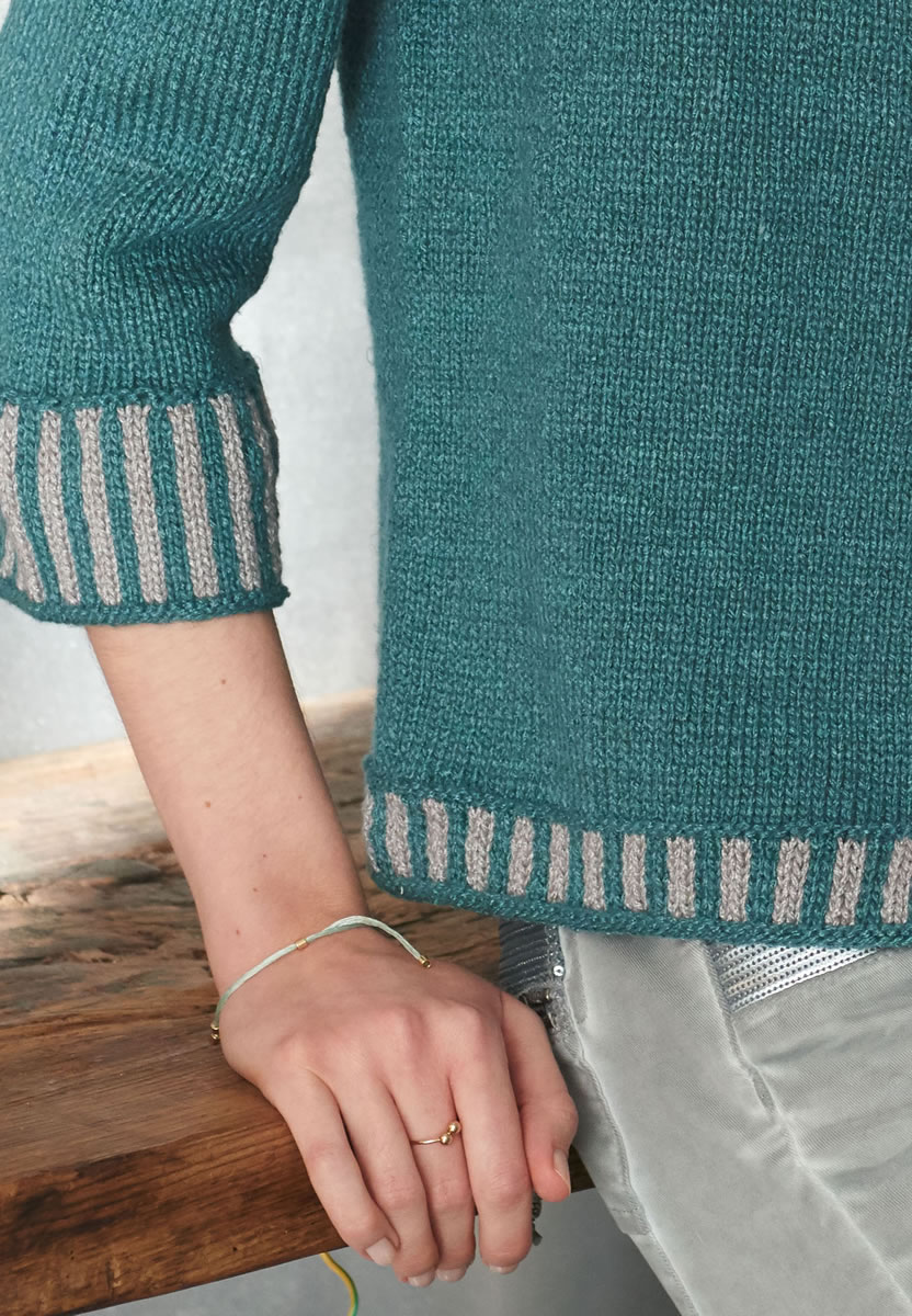 Lana Grossa Linarte (40% Viskose, 30% Baumwolle, 20% Leinen, 10% Polyamid, Lauflänge 125 m/50 g), 550 (600 – 650) g Dunkelpetrol (Fb 73) und 50 (100 – 100) g Platingrau (Fb 33); Stricknadeln Nr. 4, 8 Knöpfe von UNION KNOPF, Art. 452252, Fb Grün, Gr. 12 mm.