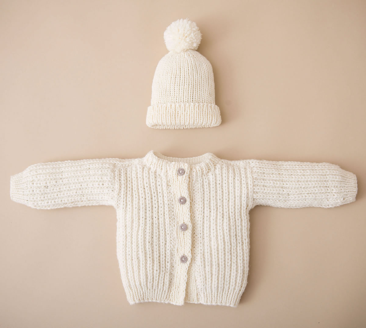 Lana Grossa Bingo (100 % Schurwolle, Lauflänge 80 m/50 g) 300 (350/350) g Rohweiß (Fb 5); Stricknadeln Nr. 4,5 und 5, eine 40 cm lange Rundstricknadel Nr. 4,5, Spielstricknadeln Nr. 4,5, vier Knöpfe, Pompon-Set.