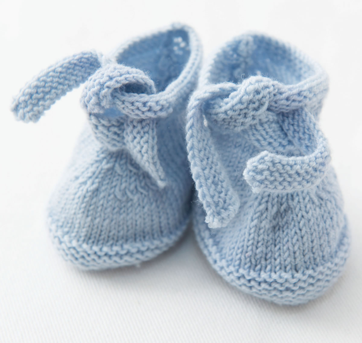 Lana Grossa Cool Wool Baby (100 % Schurwolle, Lauflänge 220 m/50 g) 50 (50/100) g Grège (Fb 212) und 50 g Hellblau (Fb 208); Stricknadeln Nr. 3, eine 40 cm lange Rundstricknadel Nr. 3, zwei Knöpfe.