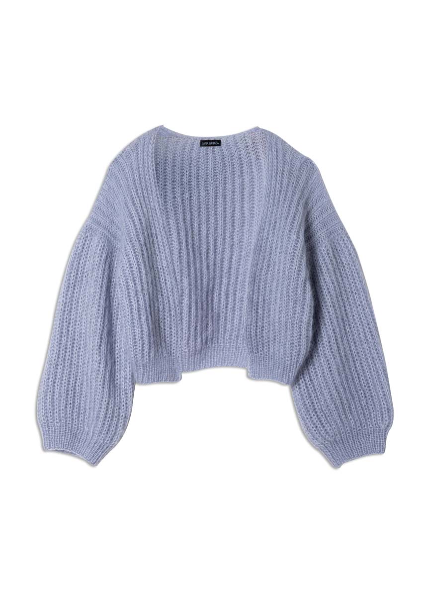 Lana Grossa-kvalitet „Silkhair” (70 % mohair (superkid), 30 % silke, löplängd = ca. 210 m/25 g): ca. 425 (450 – 475) g lysande grå (färg 189); 1 rest glatt kontrastgarn till uppläggningen; stickor nr. 6 och 8, rundsticka nr. 8, 50 och 100 cm lång, rundsticka nr. 6, 40 och 100 cm långa. Tips: St allt med fyrdubbelt garn! Använd helst två nystan och ta tråden både inifrån och utifrån.