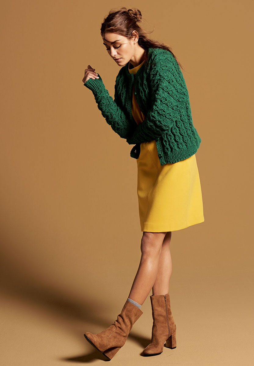 Wenn die Temperaturen in den Keller sinken, ist dieser grüne, mit Aranmustern gestrickte Cardigan unser neuer bester Freund. Er besteht aus drei Teilen, lässt sich vielseitig kombinieren und das Beste: Wir fühlen uns immer gut gekleidet.