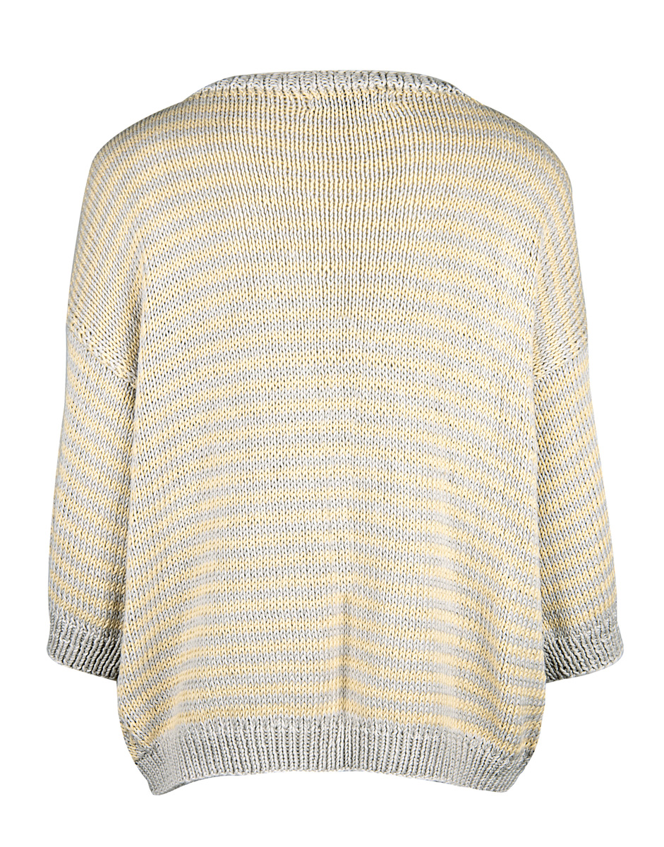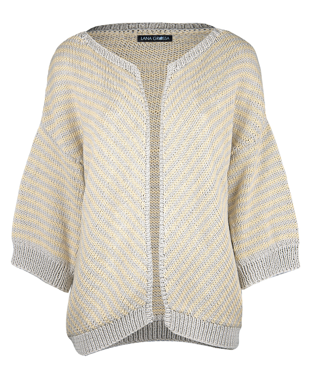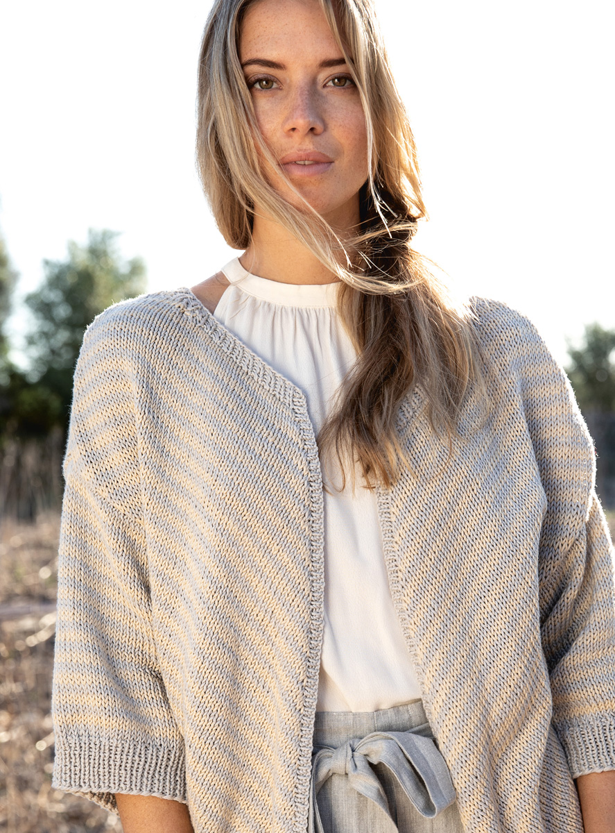 Lana Grossa-kvalitet „Organico“ (100 % bomull, löplängd = ca. 90 m / 50 gr.): ca. 300 gr ljus grå (färg 29) och 250 gr beige (färg 100), stickor nr. 4 och 5, rundsticka nr. 4, 80 cm.