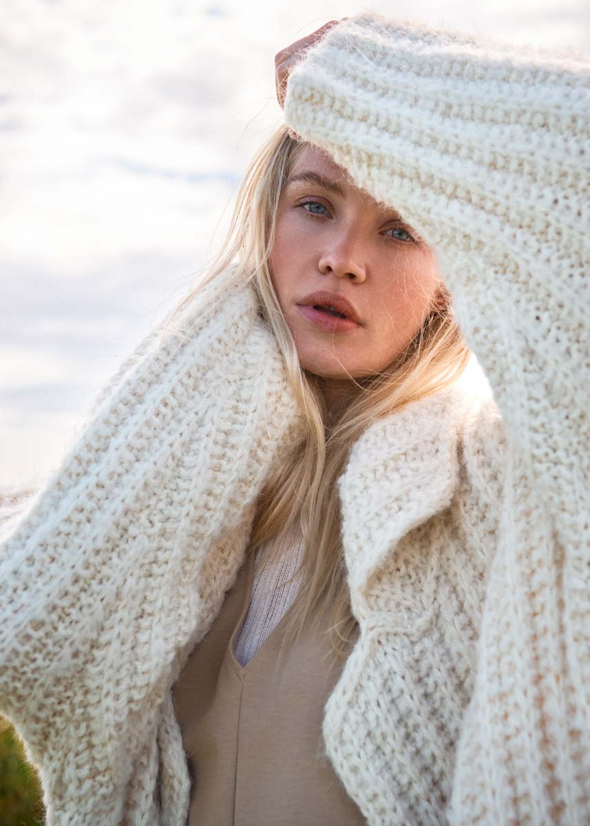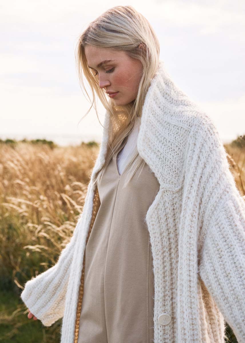 Garn: Lana Grossa Alta Moda Alpaca (90 % alpakka (baby), 5 % polyamid, 5 % ny ull (merino); LL = 140 m/50 g): 700 (750/850/950) g natur (frg nr. 14) og Natural Alpaca Lungo (89 % alpakka (baby), 11 % polyamid; LL = 190 m / 50 g): 500 (550/650/700) g natur (frg nr. 1) Pinner: Rundpinne (80–100 cm) 9 mm, hjelpepinne Tilbehør: 4 knapper i passende farge, 35 mm i diameter