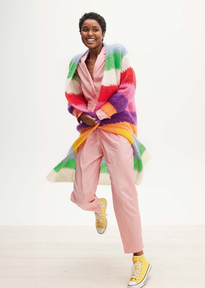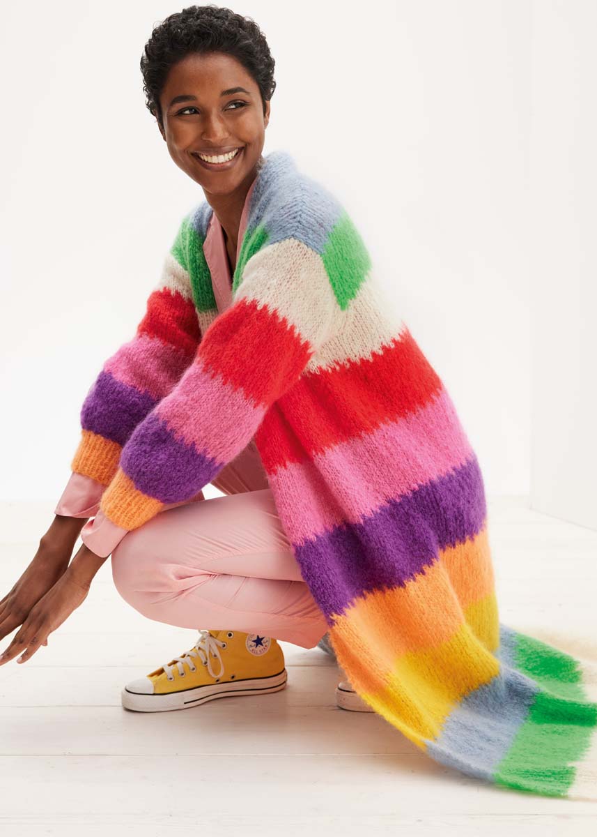 Lana Grossa-kvalitet „Mohair Moda” (70 % mohair (kid mohair), 20 % ren ny ull (superfin merino), 10 % polyamid, löplängd = ca. 140 m/50 g): ca. 100 g var i röd (färg 14), pink (färg 8), råvit (färg 18), violett (färg 7), gråblå (färg 4) och jade (färg 2) och ca. 50 (100) g var i orange (färg 13) och gul (färg 1); stickor nr. 3,5, 5 och 6.
