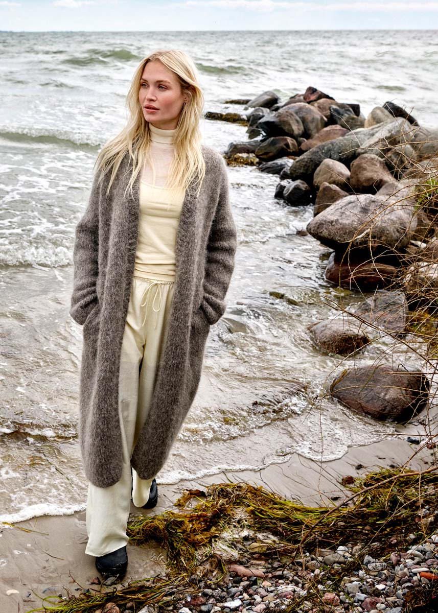 Garn: Lana Grossa Natural Alpaca Lungo (89 % alpakka (baby), 11 % polyamid, LL = 190 m/50 g): 700 (800/900/1000) g gråbeige (farge nr. 20)