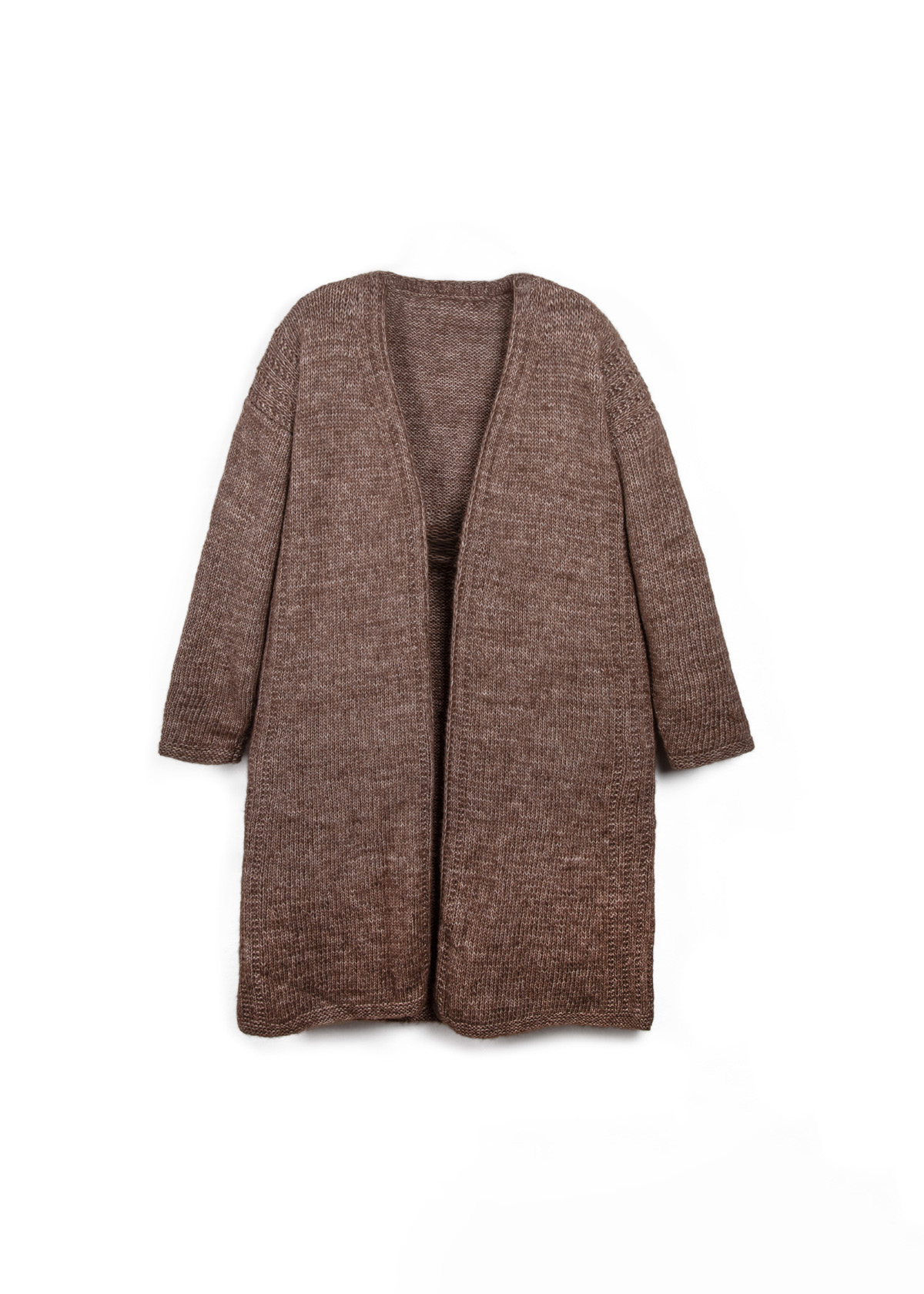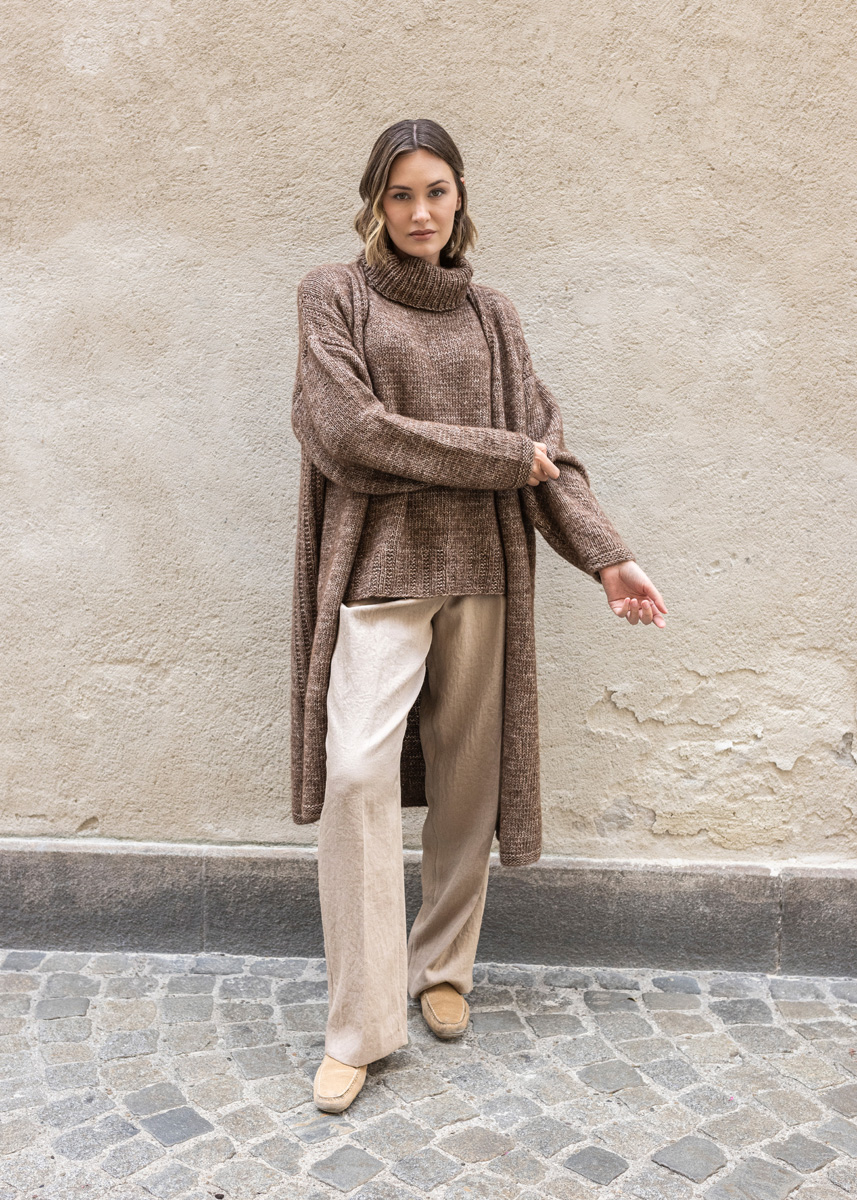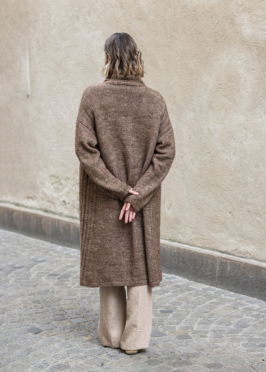 Lana Grossa NATURAL ALPACA PELO 63 % bomull, 31 % alpacka, 6 % ren ny ull merino Löplängd: ca. 125 m / 50 g • 500 (550 - 600 - 650 - 700 - 700) g mörkbrun melerad (färg 8) eller • råvit/mjukgrå (färg 2) • Stickor nr. 5 och 5,5