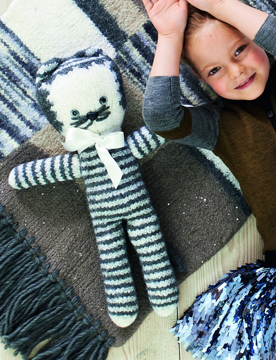 Lana Grossa Qualität „Feltro“ (100 % Schurwolle, LL = 50 m/50 g), je 150 g Rohweiß (Fb. 1) und Anthrazit (Fb. 25); Nadelspiel und Rundstricknadeln Nr. 8, 40 cm lang, Häkelnadel Nr. 8; 3 Beutel Füllwatte von PRYM (Art.-Nr. 968210); 0,8 m Satinband, 2,5 cm breit von Goldzack (Art.-Nr. 982 716); 2 Tieraugen, Ø 18 mm, von Union Knopf (Art.-Nr. 45462); 1 Tierschnauze von Union Knopf in Schwarz (Art.-Nr. 45750).