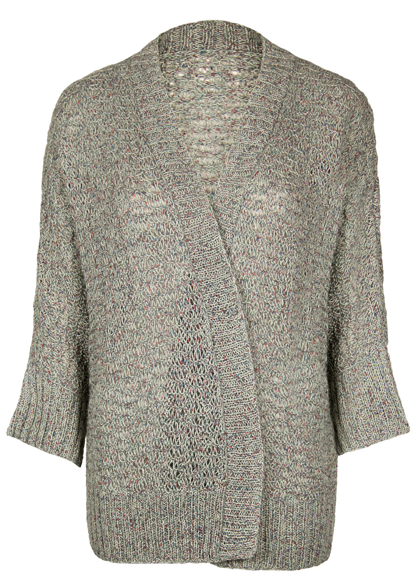 Lana Grossa-kvalitet „Ecopuno Print” (72 % bomull, 17 % ren ny ull (merino), 11 % (baby) alpacka, löplängd = ca. 215 m/50 g): ca. 350 (400 – 450) g ljus grå färgrik (färg 101); stickor nr. 4,5, rundsticka nr. 4,5, 60 och 120 cm lång.