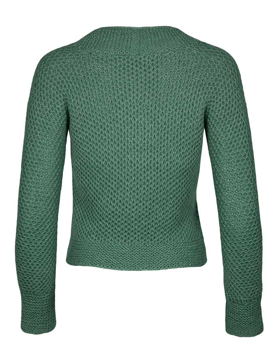 Lana Grossa-kvalitet „Fourseason“ (45 % virgin ull (extrafin merino), 40 % (bio) bomull, 15 % (rec.) kashmir löplängd = ca. 105 m / 50 gr.): ca. 400(450) gr grön (färg 7), stickor nr. 5½, rundsticka nr. 5½, 100 cm, rundsticka nr. 5, 60 cm, virknål nr. 4½, 3 knappar från Union Knopf, art. 453059, fv 7882 svartbrun, diameter 20 mm.