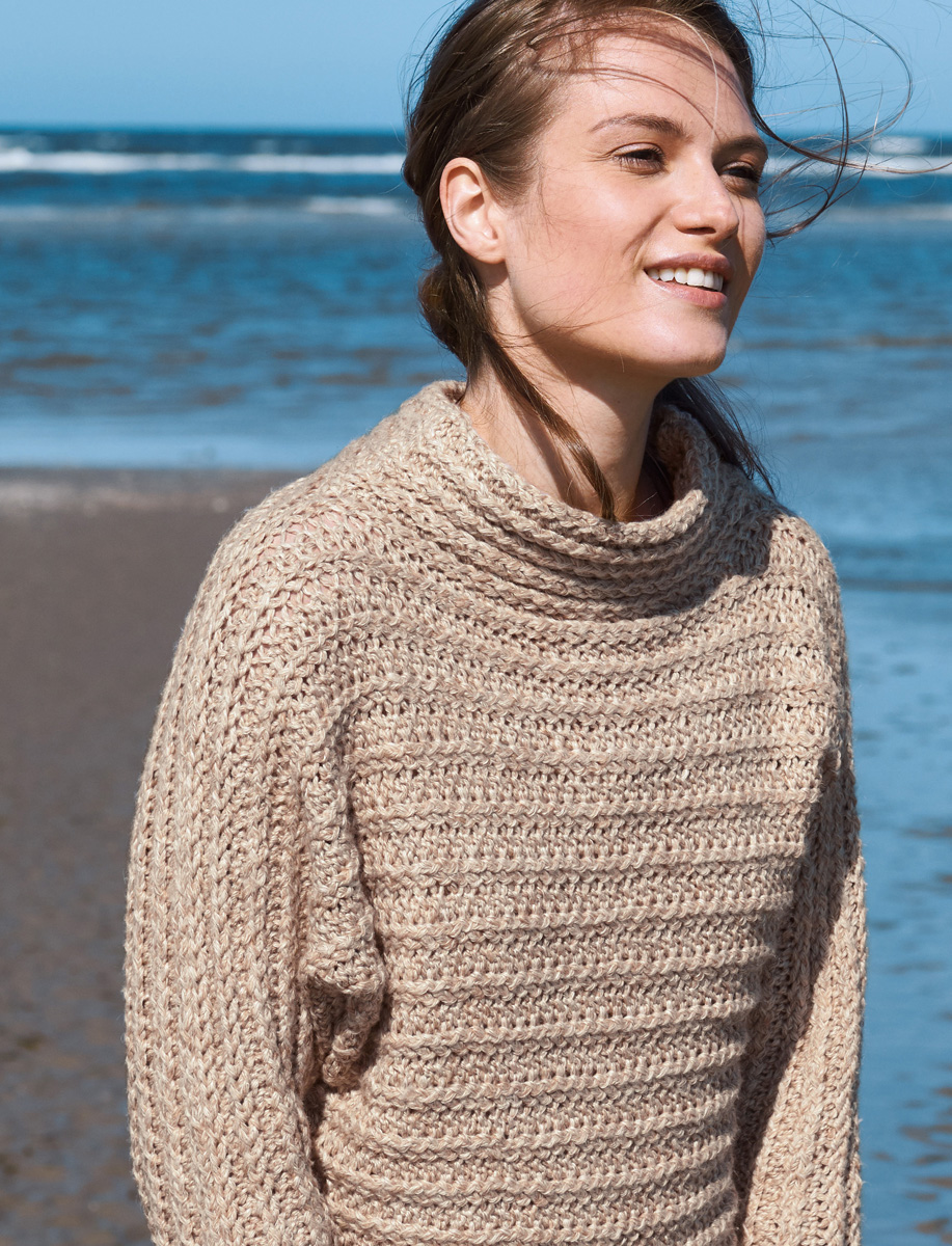 Lana Grossa-kvalitet ”Benessere” (45 % bomuld, 32 % alpaka, 23 % polyamid, løbelængde = ca. 125 m / 50 gr.): 400(450) gr beige/råhvid (fv 3), strikkepinde nr. 5 og 6, rundpinde nr. 5 og 6, 60 cm