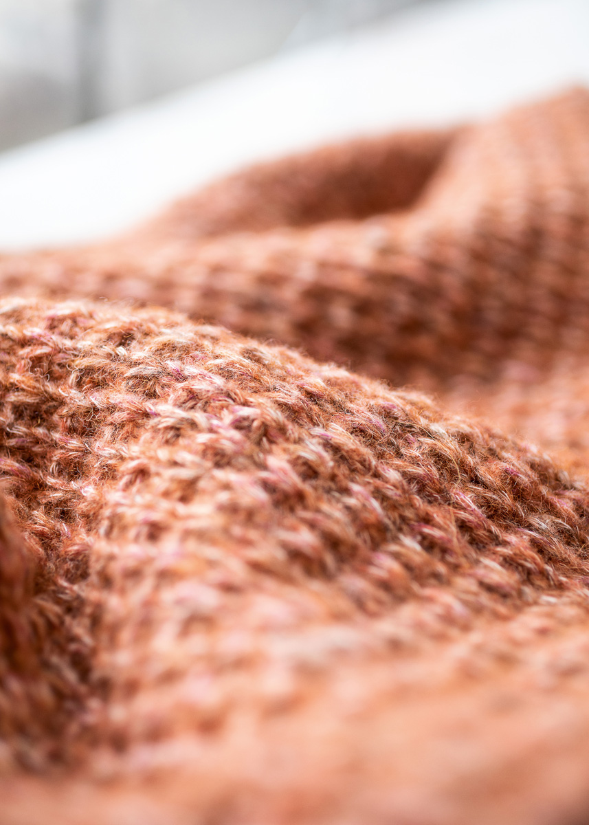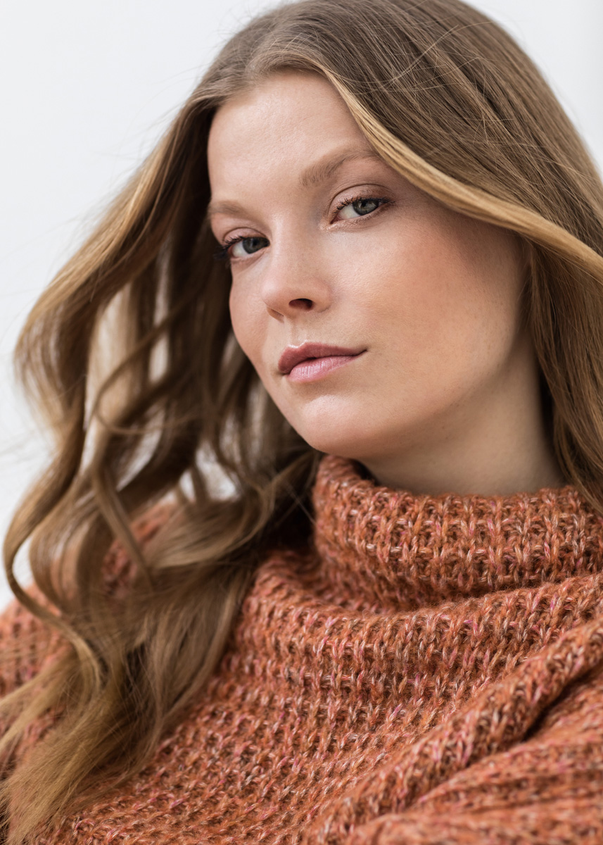 Lana Grossa-kvalitet „Sara” (65 % bomull, 30 % (baby) alpacka, 5 % ren ny ull (merino), löplängd = ca. 125 m/50 g): ca. 350 (400) g rost melerad (färg 3); stickor nr. 5,5, rundstickor nr. 5,5, 40 och 80 cm långa.