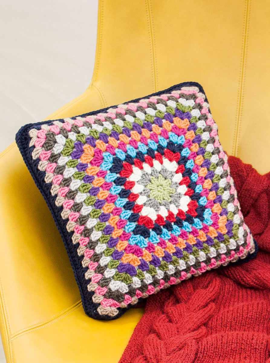 Lana Grossa-Qualität „Bingo” (100 % Schurwolle (Merino extrafine, waschmaschinenfest), LL = ca. 80 m/50 g): ca. 250 g Nachtblau (Fb. 8), je ca. 50 g Kirschrot (Fb. 44), Orange (Fb. 74), Fuchsia (Fb. 169), Olivgrün (Fb. 148), Dunkelgrau meliert (Fb. 120), Weiß (Fb. 23), Türkis (Fb. 133), Neonviolett (Fb. 710), Hellgrau meliert (Fb. 1) und Pink (Fb. 159) und Lana Grossa-Qualität „Bingo Melange” (100 % Schurwolle (Merino extrafine, waschmaschinenfest), LL = ca. 80 m/50 g): je ca. 50 g Oliv meliert (Fb. 206), Schlamm meliert (Fb. 207) und Camel meliert (Fb. 200); 1 Wollhäkelnadel Nr. 4,5; 1 waschbare Kissenfüllung 35 x 35 cm.