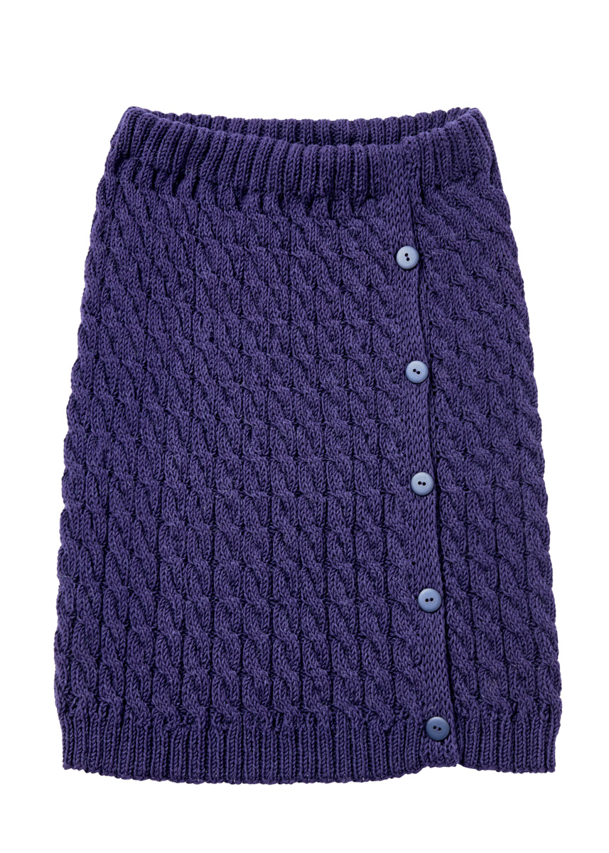 Lana Grossa-kvalitet „Brigitte No. 4“ (80 % bomull, 20 % alpacka, löplängd 110 m/50 g): 400 (400/450/450) g i nattblå (färg nr. 15). Stickor 4 och 4,5 (löst stickat) eller 4,5 och 5 (stramt stickat) – kontrollera stickfastheten. 1 flätsticka. 5 knappar i mörk blå färgnummer 68, 20 mm diameter, Artikelnummer 28450 från Union Knopf. Gummiband, ca. 3,5 cm bred i midjelängd (1m) från Prym.