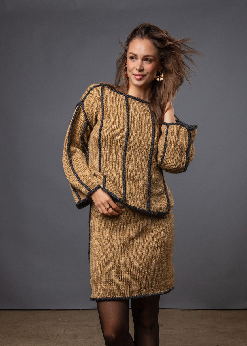 Kjolen stickas i ett stycke, uppifrån och ned, först fram och tillbaka och därefter runt.