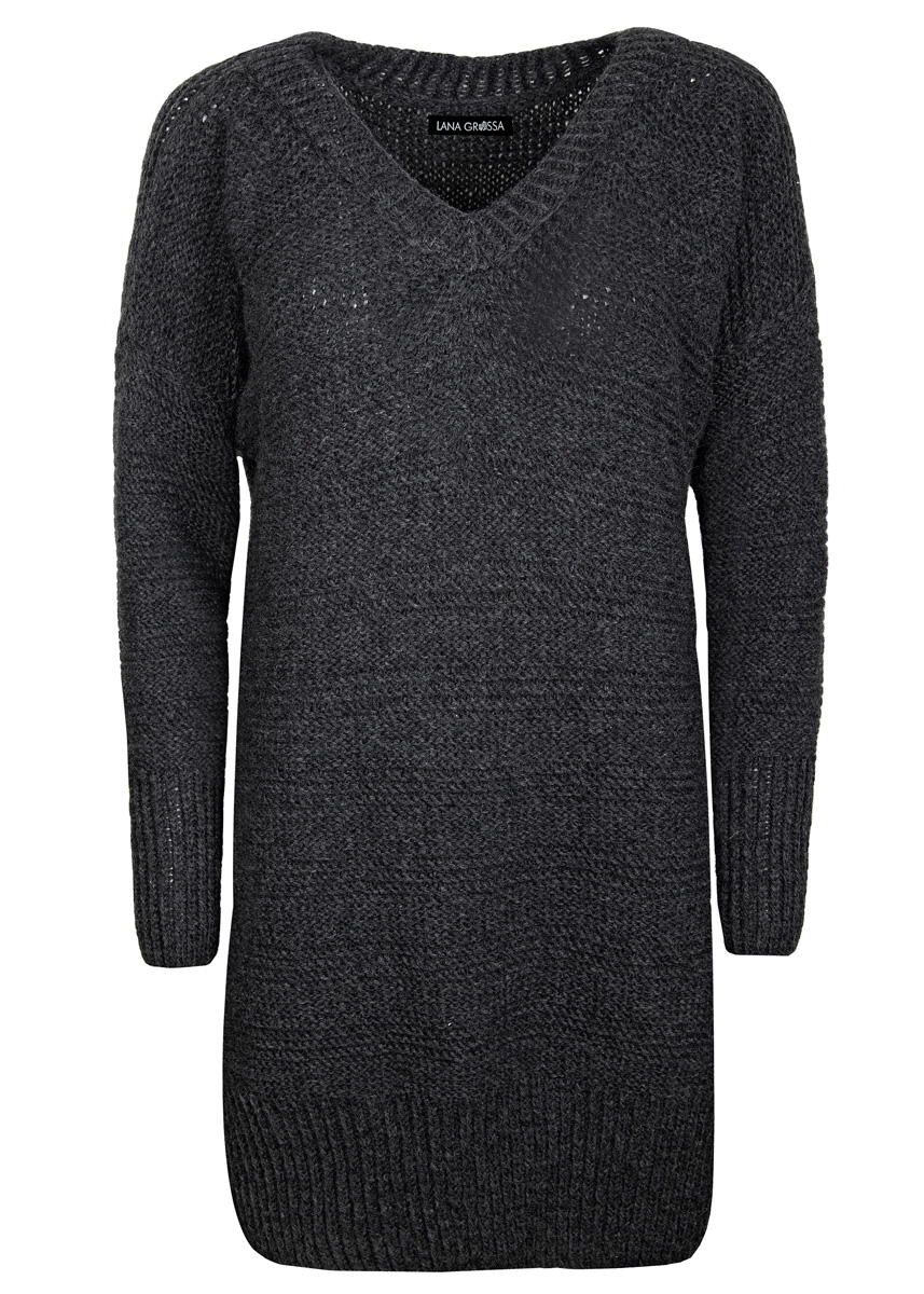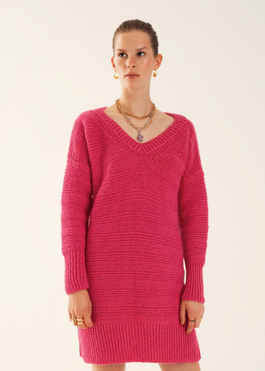 Lana Grossa „Brigitte No. 2“ (47% alpakka, 45% bomull, 8% ren ny ull; løpelengde ca. 140 m/50 g), 550 (600/650) g i pink (farge 19) ELER sølvgrå (farge 13) ODER skiffer (farge 24); strikkepinner nr. 5 og 6 og 1 rundpinne nr. 5 i 40 cm lengde.