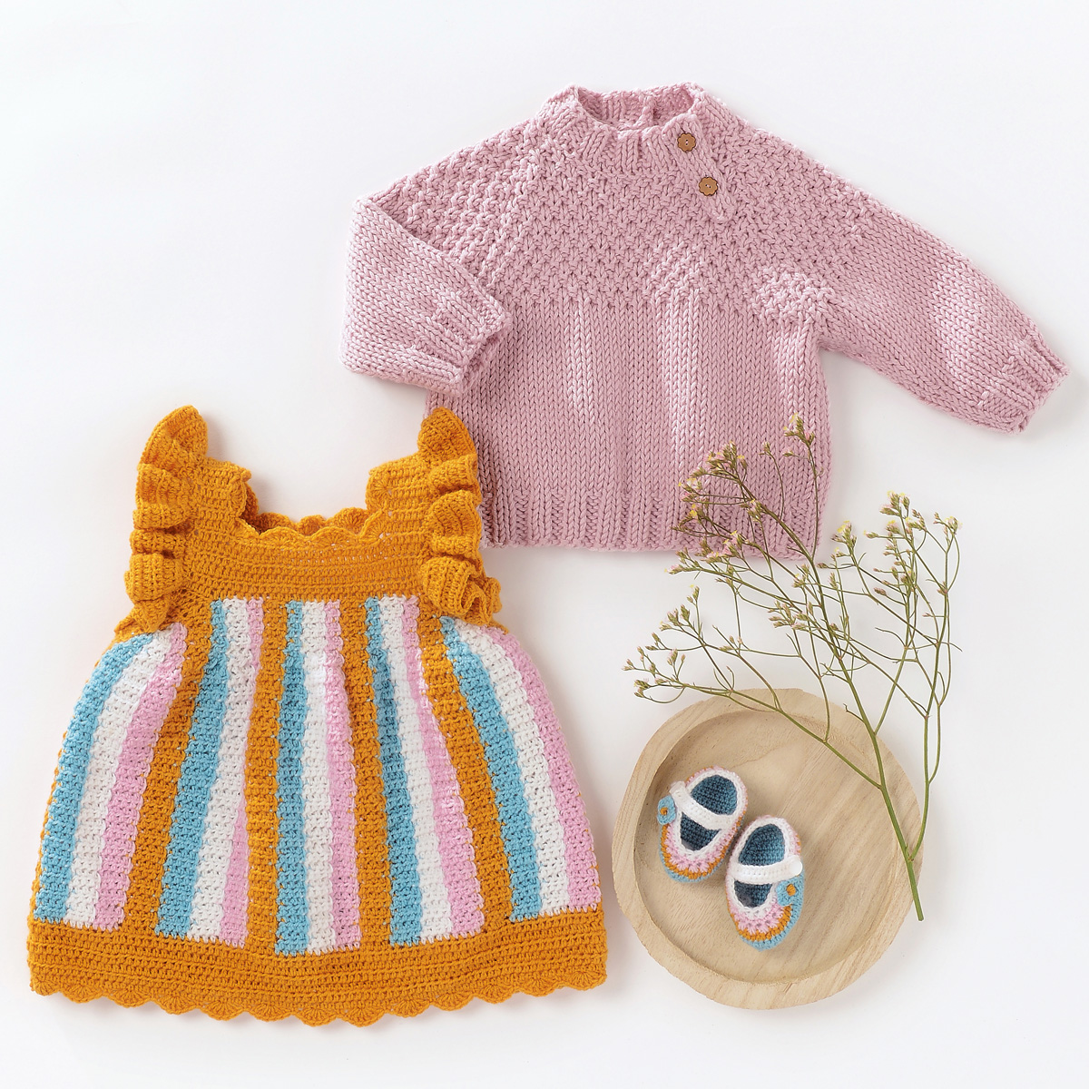 Lana Grossa-kvalitet ”Cool Wool Baby” (100 % ren ny uld, løbelængde = ca. 220 m / 50 gr.): 100(150-150-200) gr orange (fv 275), 100 gr mint (fv 261), 50 gr rosa (fv 216) og 50 gr hvid (fv 207), hæklenål nr. 3, 1 trykknap 10 mm Ø