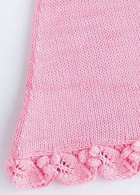 Lana Grossa-kvalitet ”Cotton Love” (100 % (bio) bomuld, løbelængde = ca. 170 m / 50 gr.): 100(100-150-150) gr rosa (fv 13), strikkepinde nr. 3, rundpind nr. 3½, 2 knapper 15 mm Ø.