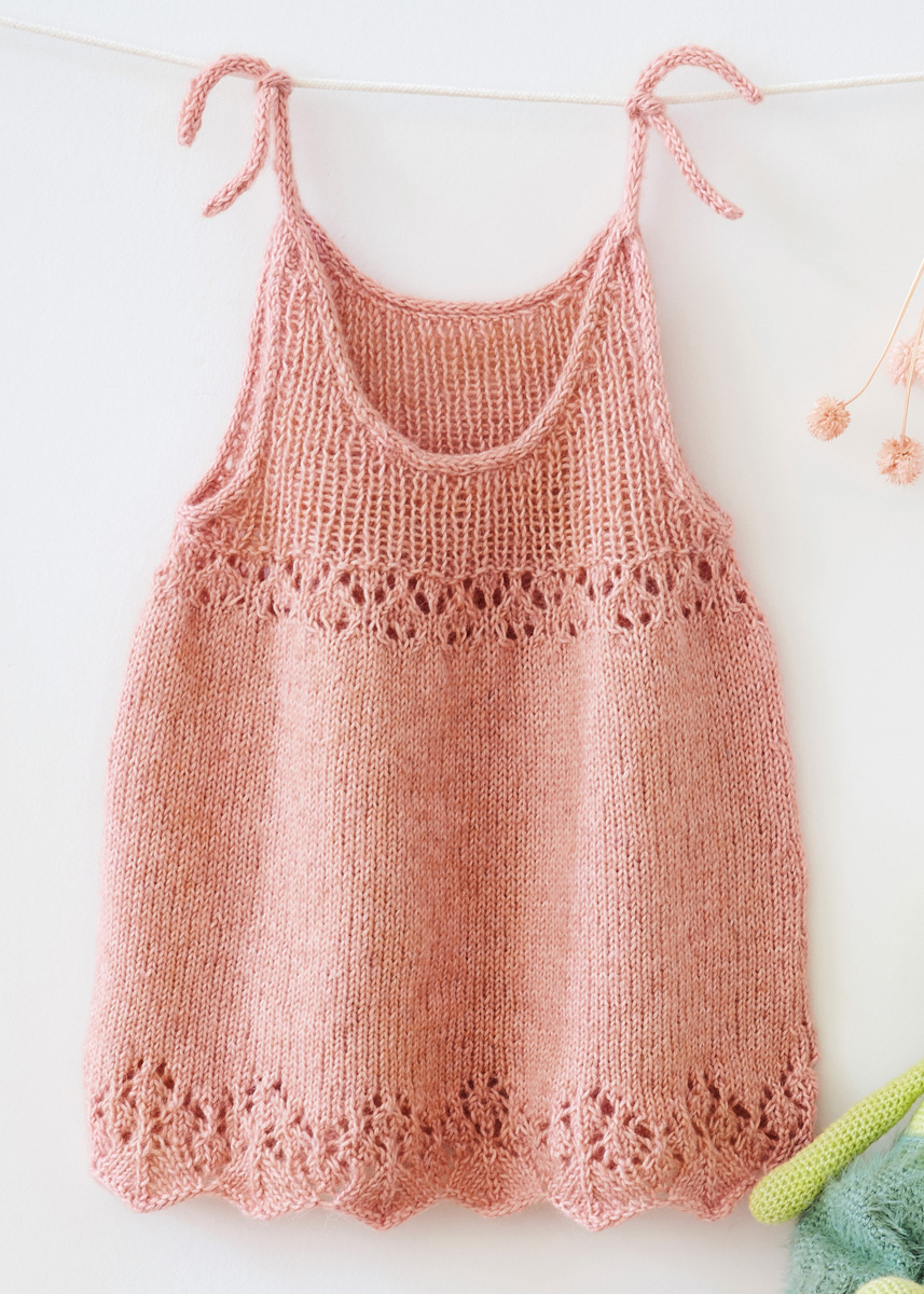Lana Grossa-kvalitet ”Ecopuno” (72 % bomuld, 17 % ren ny (merino), 11 % alpaka (baby), løbelængde = ca. 215 m / 50 gr.): ca. 100(100-150-150) gr fersken (fv 7), strikkepinde nr. 3, rundpind nr. 3, 40 cm, 2 strømpepinde nr. 3.