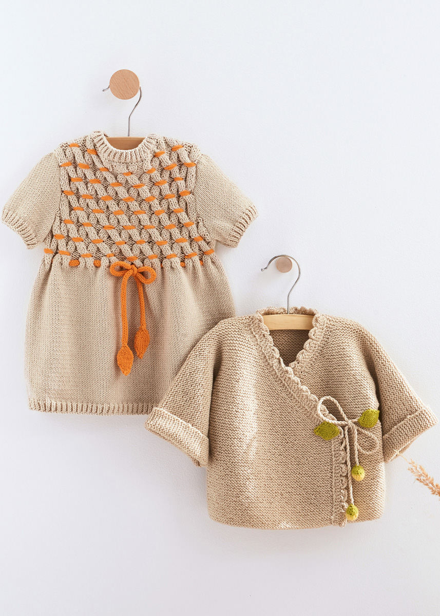 Lana Grossa-kvalitet ”Elastico” (96 % bomuld, 4 % polyester (elité), løbelængde = ca. 160 m / 50 gr.): 150(150/200-250) gr beige (fv 97) og 50 gr abrikos (fv 158), strikkepinde nr. 3½ og 4, rundpind nr. 3½, 40 cm, 1 trykknap 10 mm Ø.