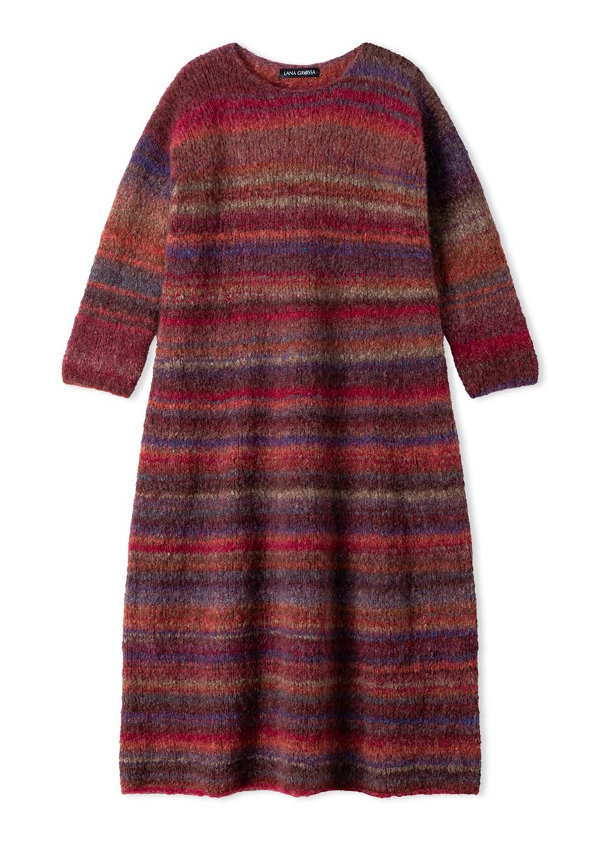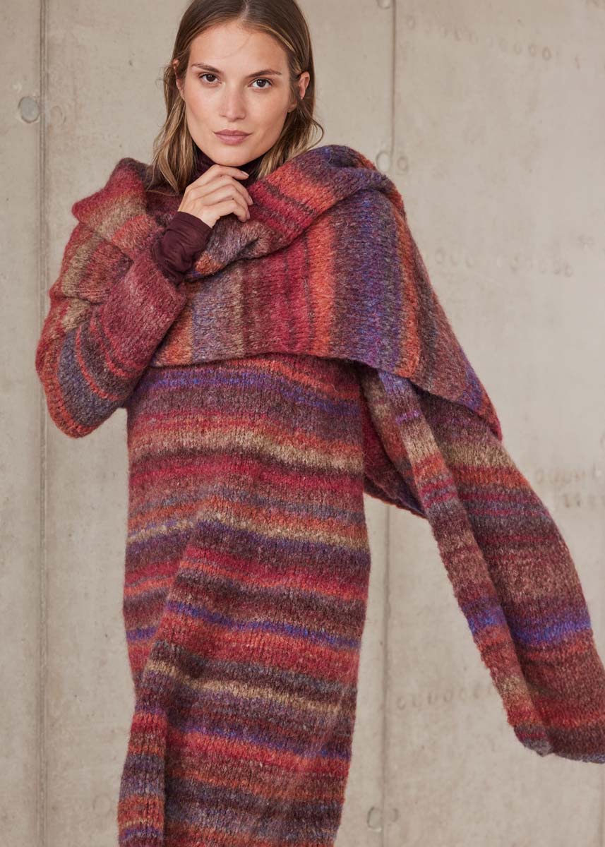 Lana Grossa Gigante Multi (70% alpakka (fein), 30% polyamid, løpelengde 150 m/50 g), 450 (500) g i Vinrød/rødbrun/grårød/aubergine/khaki/gråbrun (farge 103); rundpinne nr. 4, 60 cm og 100 cm lang; 1 rundpinne nr. 4,5, 100 cm lang; settpinner nr. 4; 1 maskemarkører.