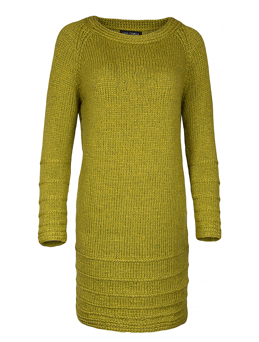 Lana Grossa-kvalitet ”Alta Moda Cashmere 16” (78 % ren ny uld 16μ, 12 % cashmere, 10 % polyamid, løbelængde = ca. 110 m / 50 gr.): ca. 550 gr sennep/oliven (fv 36), strikkepinde nr. 7, rundpind nr. 7, 50 cm