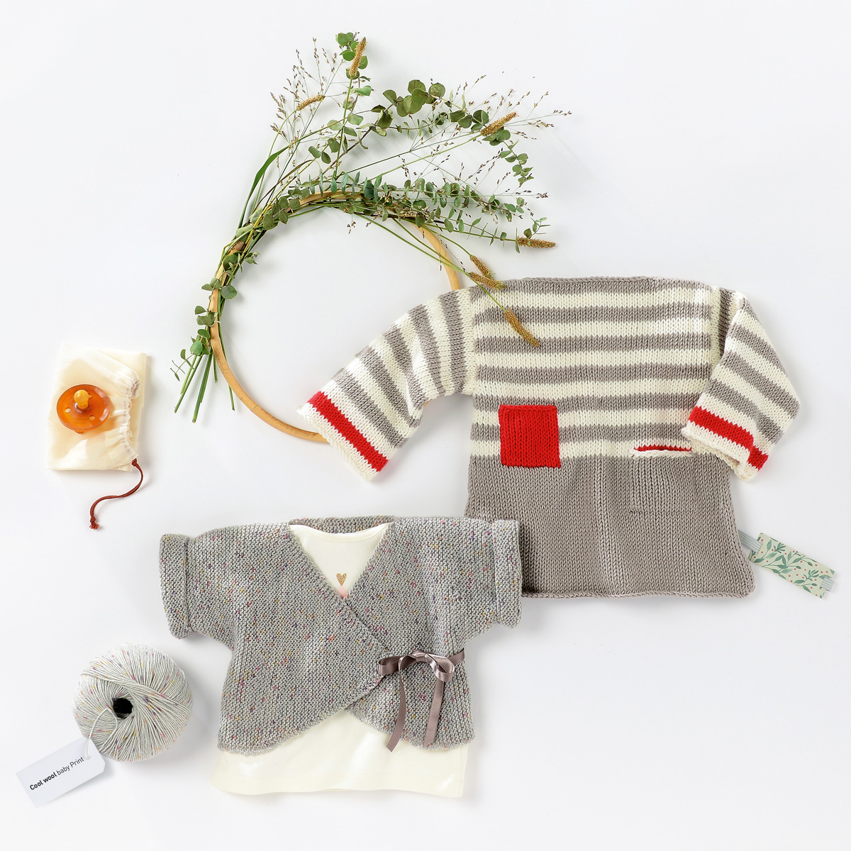 Lana Grossa-kvalitet ”Soft Cotton” (70 % bomuld, 30 % polyakryl, løbelængde = ca. 140 m / 50 gr.): 100(100-150-150) gr ecru (fv 2), 100(100-100-150) gr gråbeige (fv 4) og 50 gr rød (fv 13), strikkepinde nr. 4½, 2 trykknapper 9 mm Ø