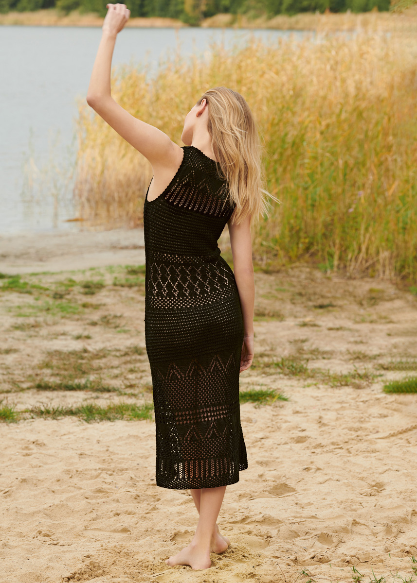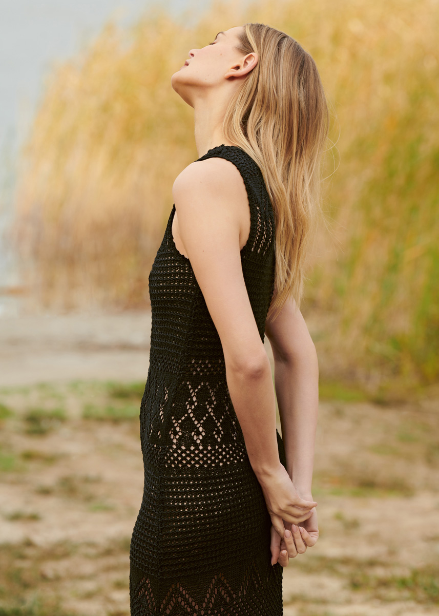 Lana Grossa-kvalitet „Solo Lino” (80 % rec. lin (Viskose), 20 % lin, löplängd = ca. 120 m/50 g): ca. 600 g [12 nystan] svart (färg 14); stickor nr. 4, 1 ullvirknål nr. 3.