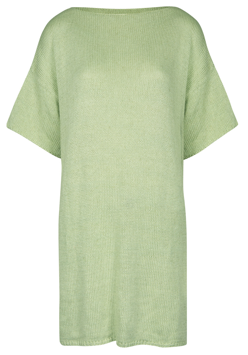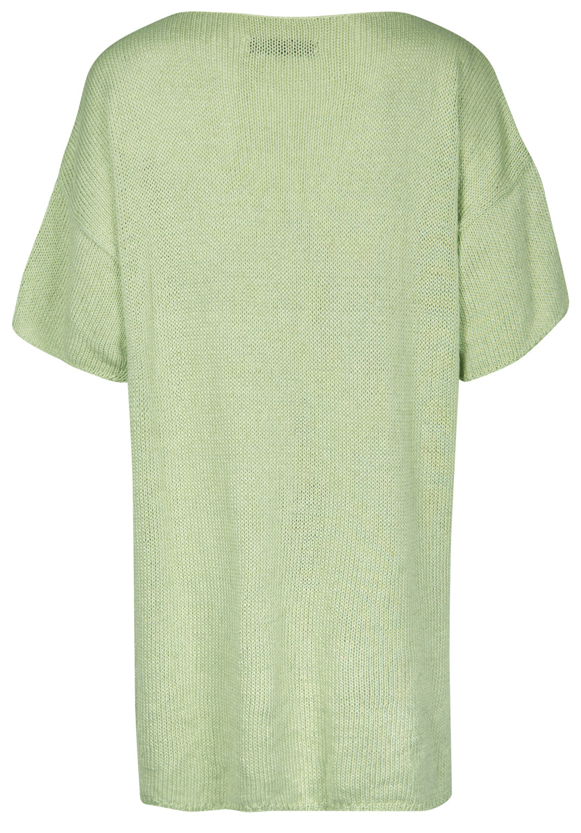 Lana Grossa-kvalitet „Solo Lino” (80 % återvunnet lin (viskos), 20 % lin, löplängd = ca. 120 m/50 g): ca. 550 (600) g ljus lindgrön (färg 50); stickor nr. 3,5 och 4.