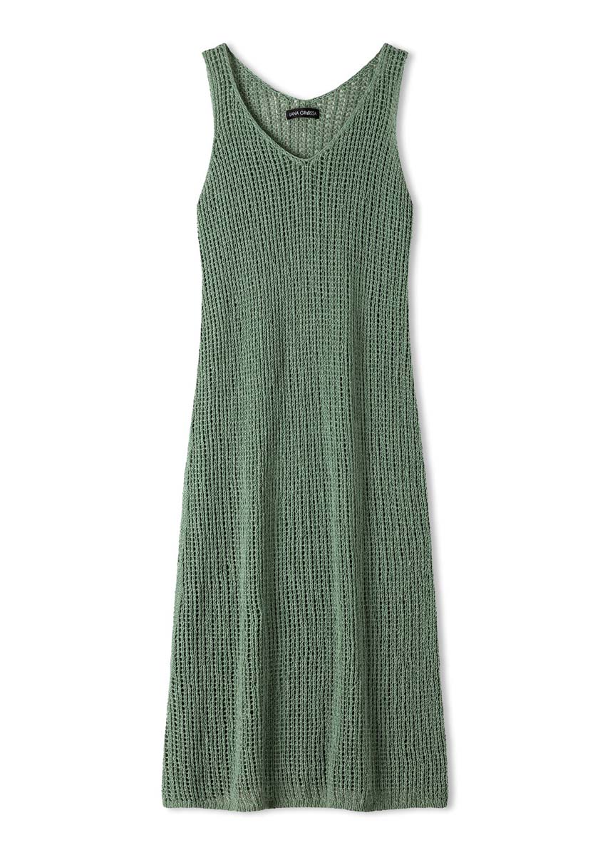 Lana Grossa „Sottile“ (85% bomull, 15% ren ny ull (merino), løpelengde 250 m/50 g), 350 g i salviegrønn (farge 14); pinner nr. 3 og nr. 3,5, 1 rundpinne nr. 3,5, 40 cm lang.