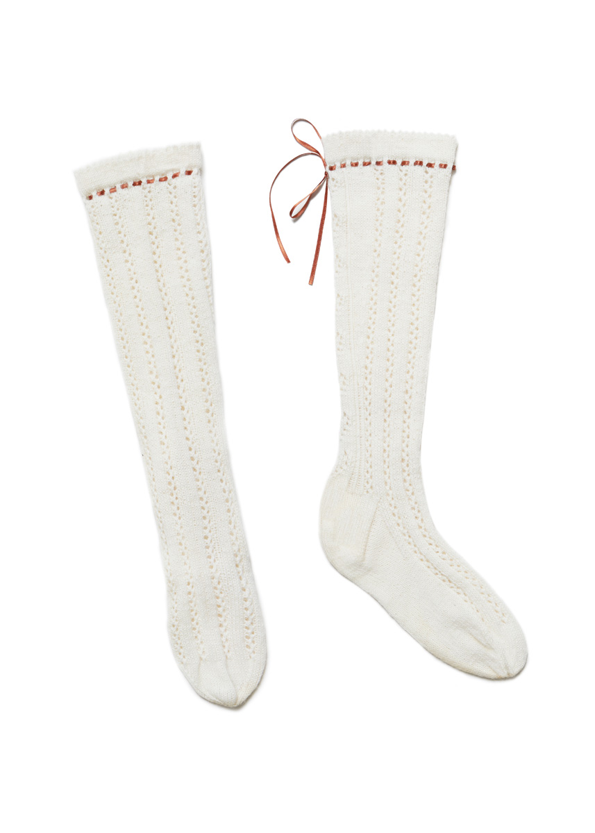 Lana Grossa Meilenweit 100g (80% Schurwolle, 20% Polyamid, Lauflänge 420 m/100 g), 200 g Rohweiß (Fb 1113); 1 Nadelspiel Nr. 2,5, cognacfarbenes Satinband, 0,5 cm breit, 2 x 90 cm lang, eventuell mehrere Maschenmarkierer.