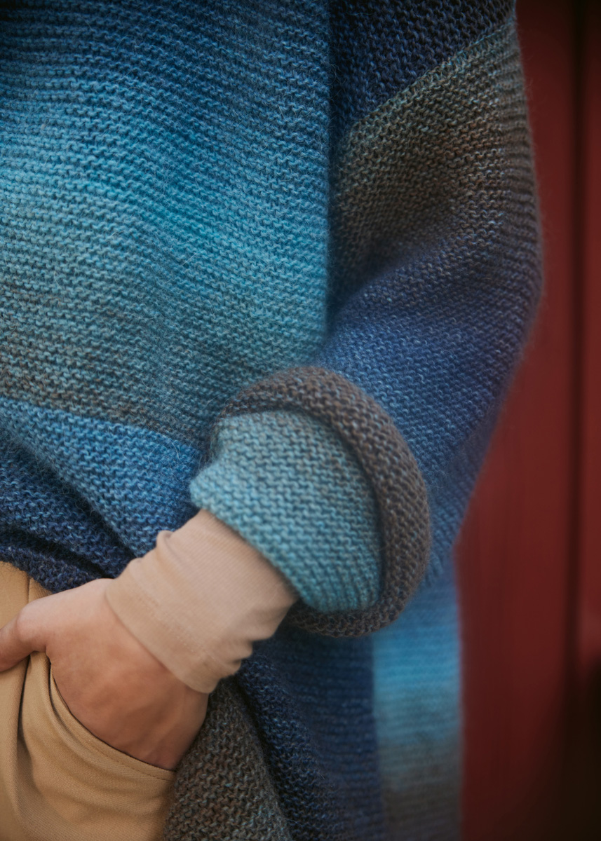 Lana Grossa-kvalitet „Gomitolo Alpaca“ (42 % (baby) alpacka, 30 % polyacryl, 18 % polyamid, 10 % ren ny ull, löplängd = ca 350 m/100 g): ca 500 (600 - 600 - 700) g mörk blå/gråblå/gråbrån/azurblå/turkos (färg 363); stickor nr. 3,5 och 4; virknål nr. 3.