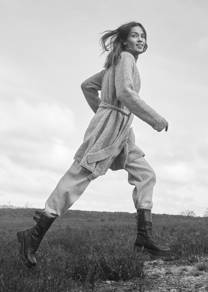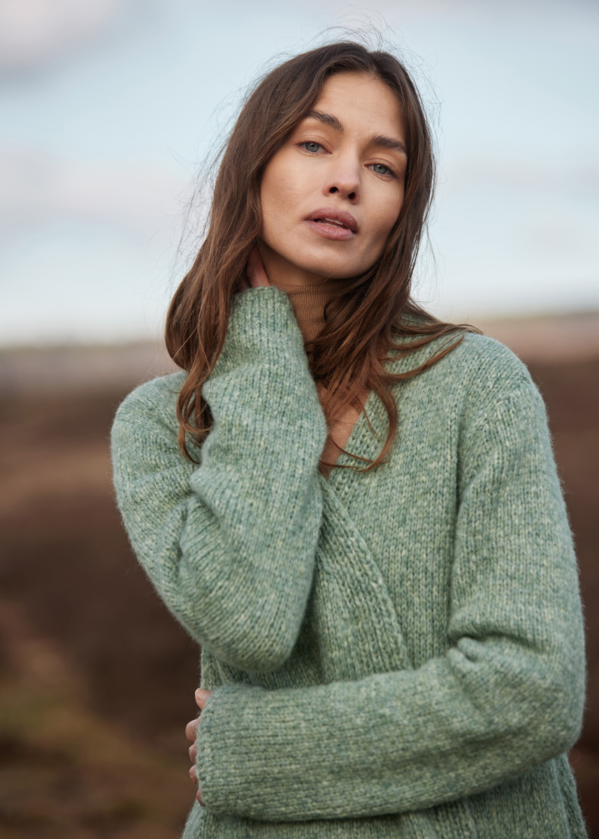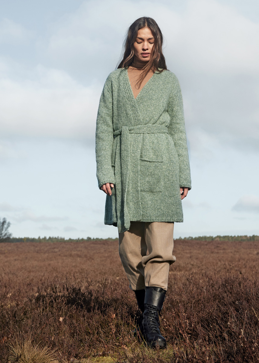 Garn: Spuma fra Lana Grossa (80 % ren (superfin merinoull), 20 % polyamid, LL = ca. 110 m/50 g): ca. 650 (650 - 700 - 750) g grågrønn (frg nr. 11) Pinner: Nr. 4,5, 5,5 og 6