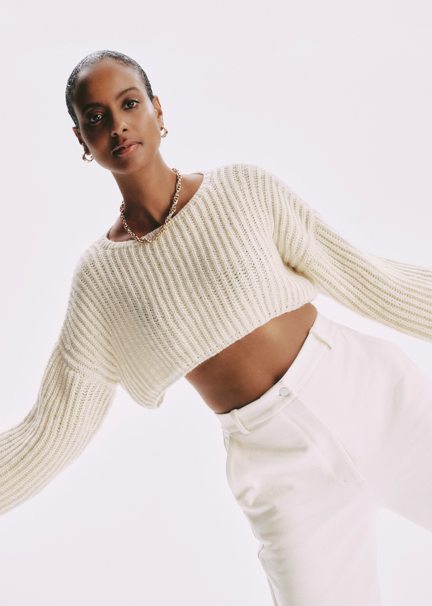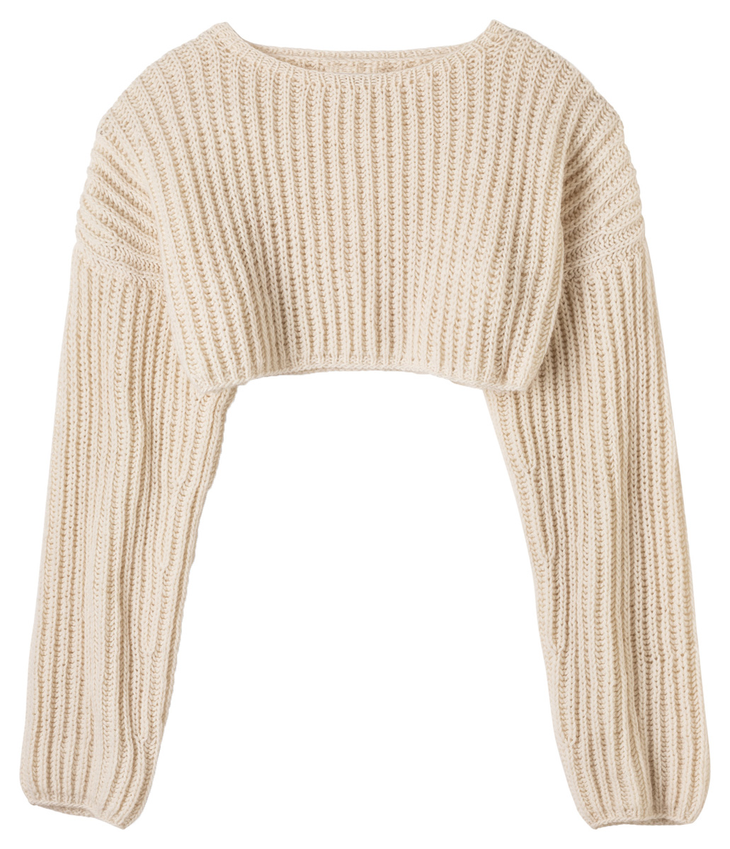 Lana Grossa Cashmere Verde (100% kashmir, löplängd 90 m/25 g), 325 (350 – 375) g råvit (färg 1); stickor nr. 4 och 4,5 och 1 rundsticka nr. 4, 40 cm lång.
