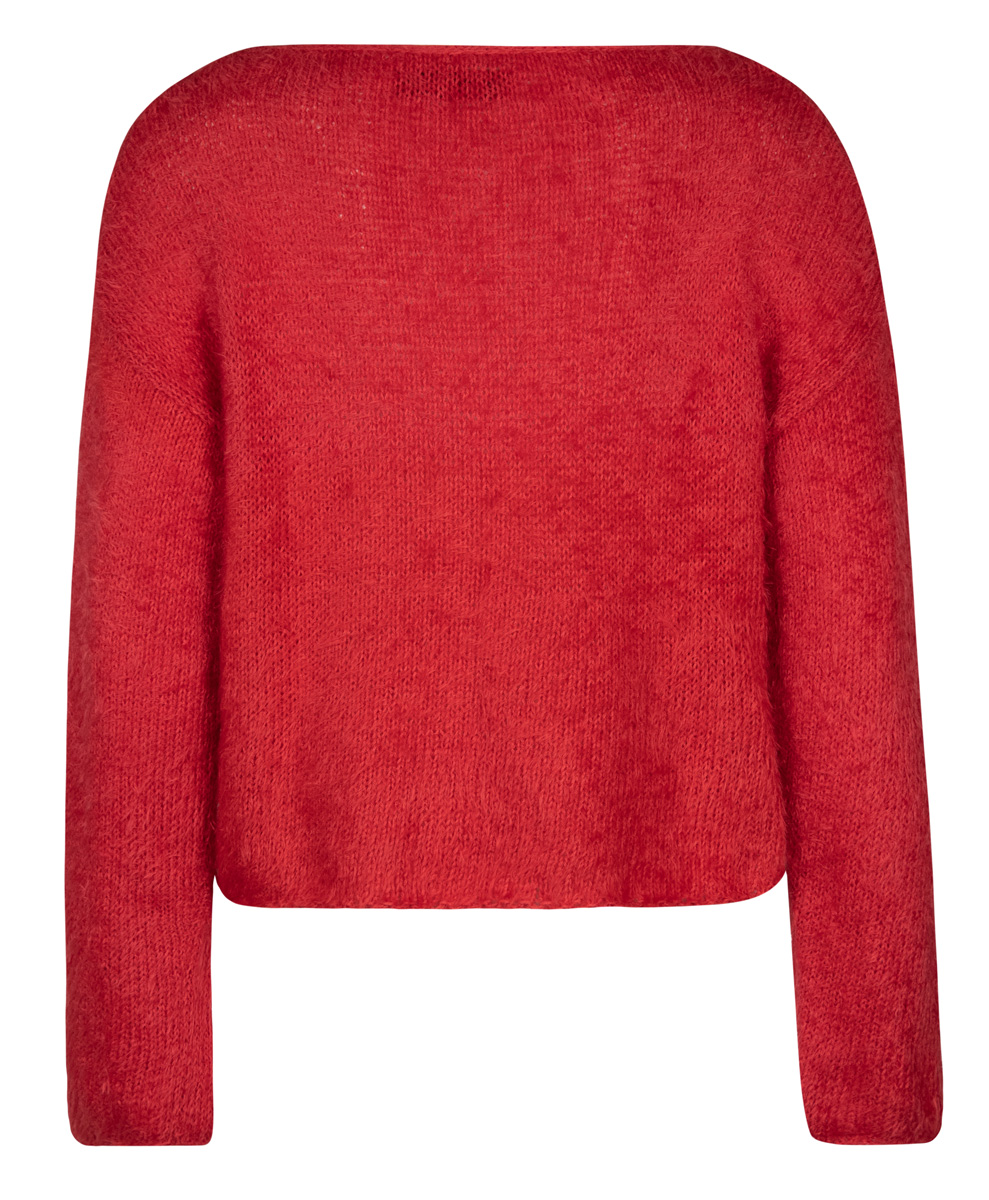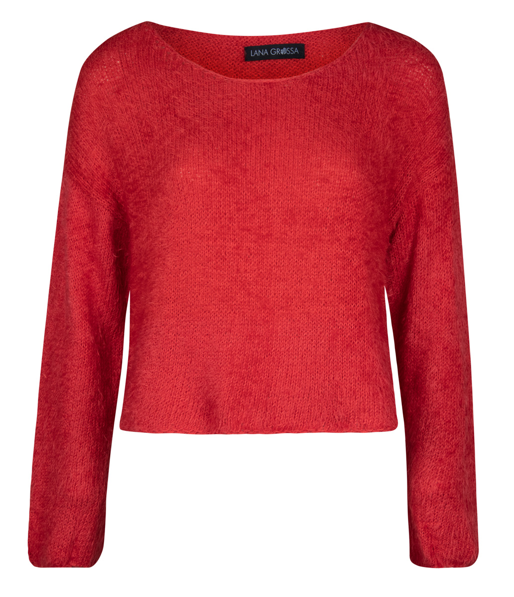 Lana Grossa-kvalitet „Per Fortuna” (74 % (bio) bomull, 26 % polyamid, löplängd = ca. 190 m/50 g): ca. 250 (300) g röd (färg 2); stickor nr. 5, 1 ullvirknål nr. 3,5.