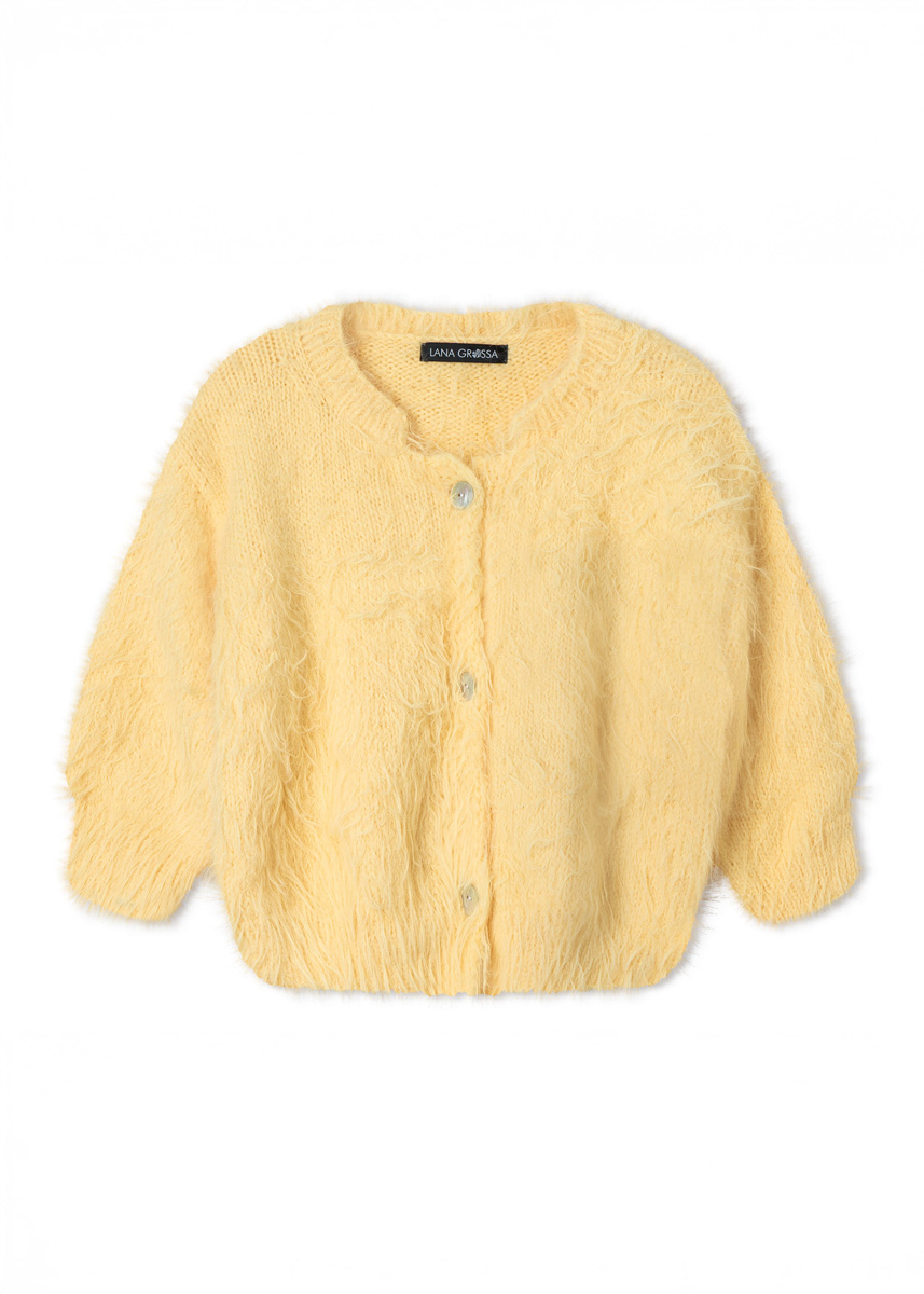 Lana Grossa-kvalitet „Basta“ (50% ren ny ull (merino), 50 % polyamid, løpelengde = ca 100 m/50 g): 350 (350 - 400 - 450) g vanilje (farge 32); pinner nr. 4 og 5; 3 (4 - 4 - 4) perlemorsknapper diameter 20 mm.