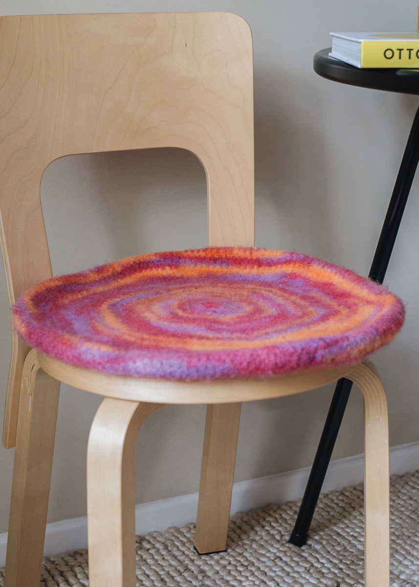 Lana Grossa-kvalitet „Feltro Print“ (100 % ren ny ull, löplängd = ca 50 m/50 g): ca 350 g beige/lax/syren/taupe/ rosa (färg 390); Lana Grossa-kvalitet „Feltro“ (100 % ren ny ull, löplängd = ca 50 m/50 g): ca 200 g pink (färg 38); virknål nr. 8. 1 maskmarkör.