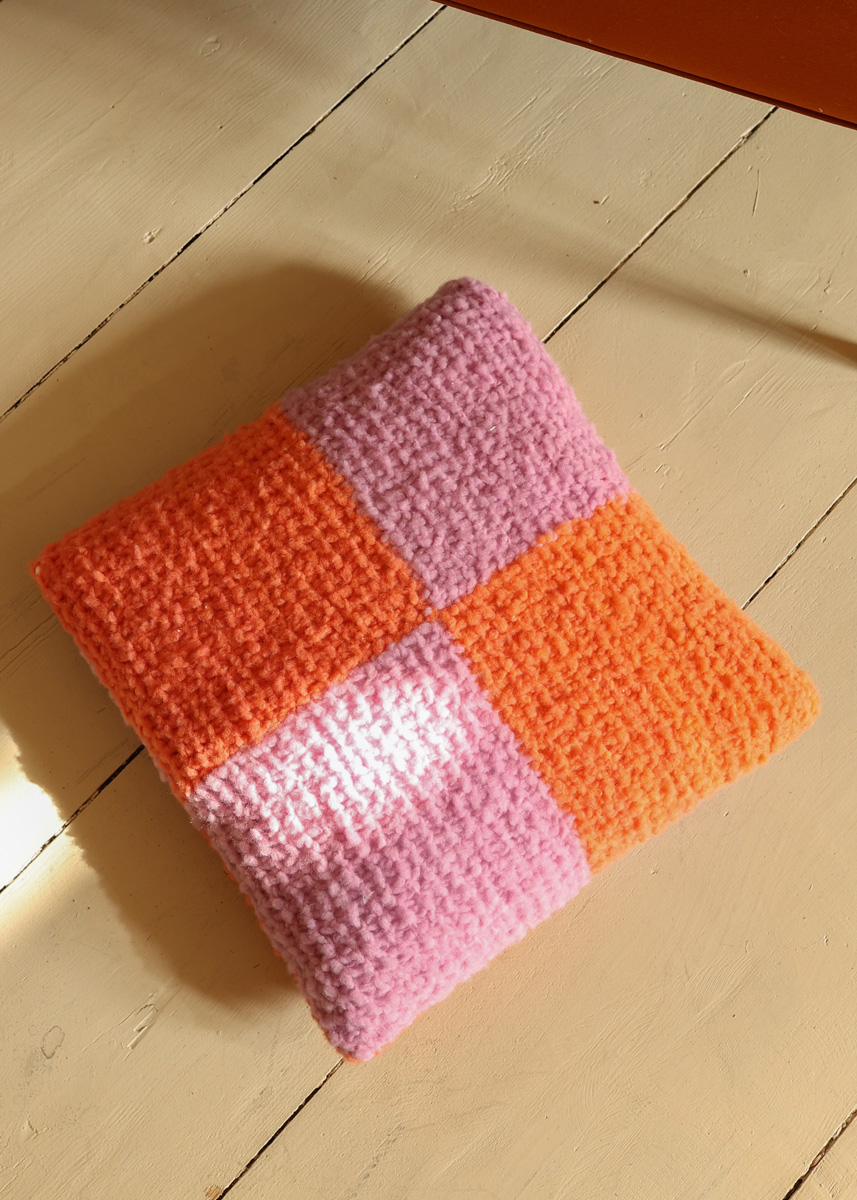 Lana Grossa-kvalitet „Lala Berlin Cloudy” (93 % ren ny ull (merino extrafine), 7 % nylon, löplängd = ca. 100 m/50 g): 1. Variant: ca. 50 g var i rosa (färg 6) och lax (färg 3), 2. Variant: ca. 50 g var i fuchsia (färg 4) och ljus gråblå (färg 12); stickor nr. 7; kudde (tvättbar), 40 x 40 cm.