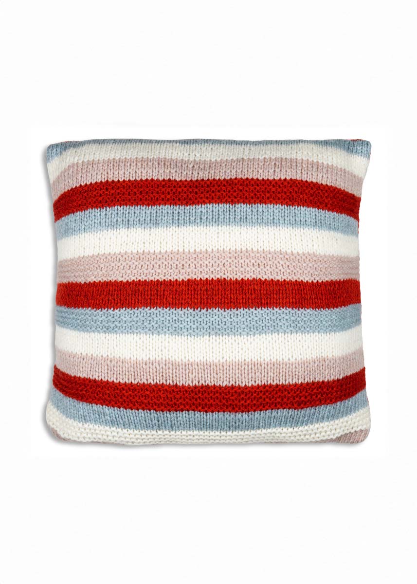Lana Grossa-kvalitet „Alta Moda Cashmere 16” (78 % ren ny ull (merino), 12 % kashmir, 10 % polyamid, löplängd = ca. 110 m/50 g): je ca. 100 g röd (färg. 71), beige (färg. 76), pastellblå (färg. 54) och råvit (färg. 16); stickor nr. 7,5; 1 tvättbar kudde/kuddfyllning, 45 ggr 45 cm.
