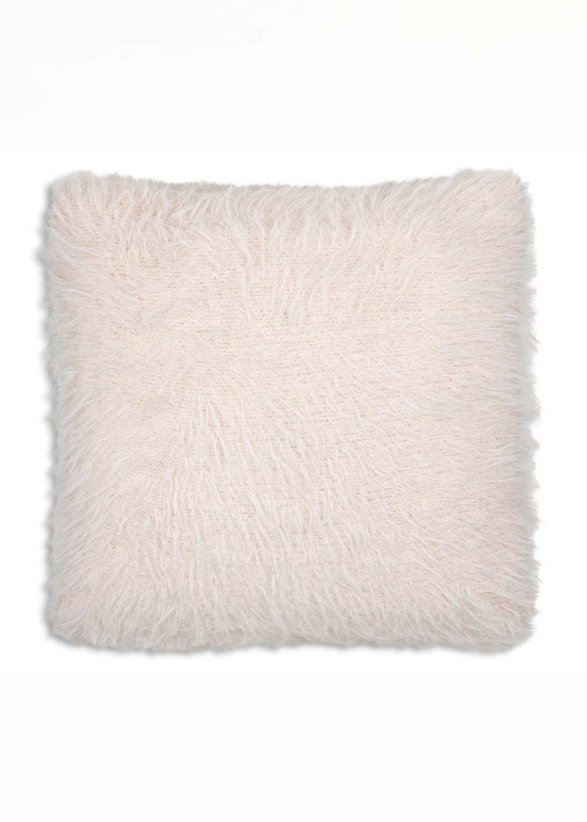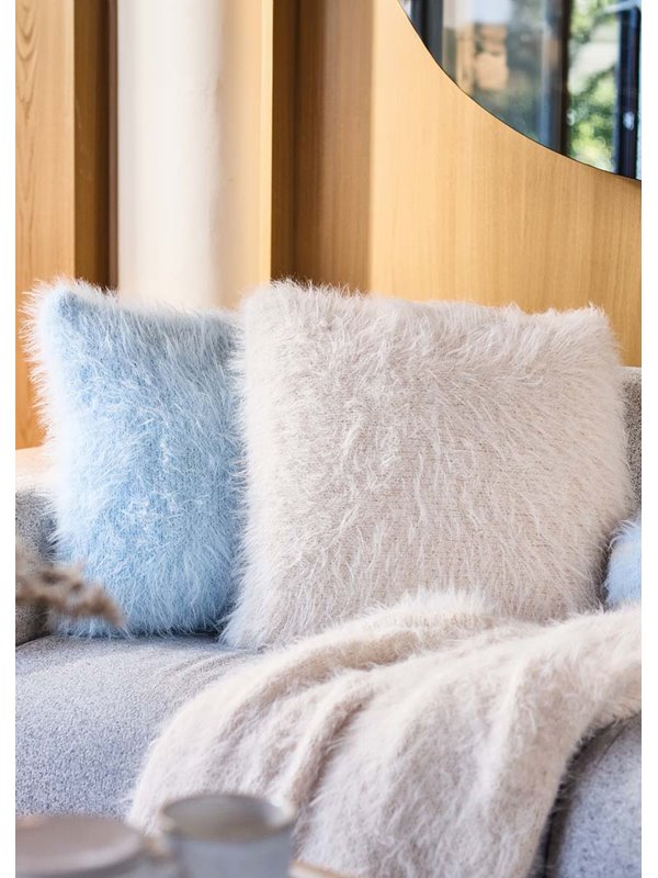Lana Grossa-kvalitet „Basta” (50 % ren ny ull (merino), 50 % polyamid, löplängd = ca. 100 m/50 g): ca. 300 g var i ljusbeige (färg. 2) och mjukblå (färg. 17); stickor nr. 6; 2 tvättbara kuddar/ kuddfyllningar, 50 x 50 cm var. Tips: Sticka ett kuddöverdrag i var färg!