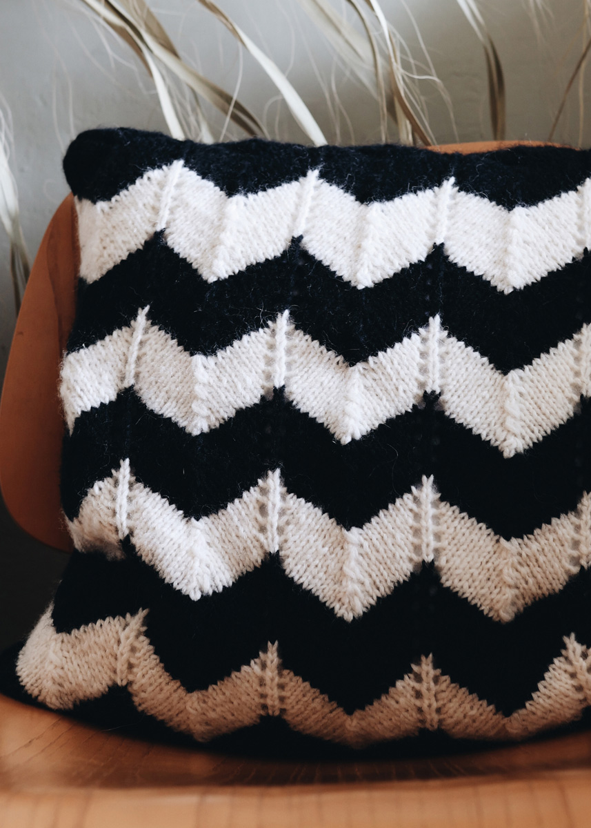 Lana Grossa-kvalitet „Brigitte No. 2” (47 % (baby) alpacka, 45 % bomull, 8 % ren ny ull (merino), löplängd = ca. 140 m/50 g): ca. 150 g svart (färg 36) och ca. 100 g råvit (färg 16); stickor nr. 4; tvättbar kuddfyllning, 40 x 40 cm.